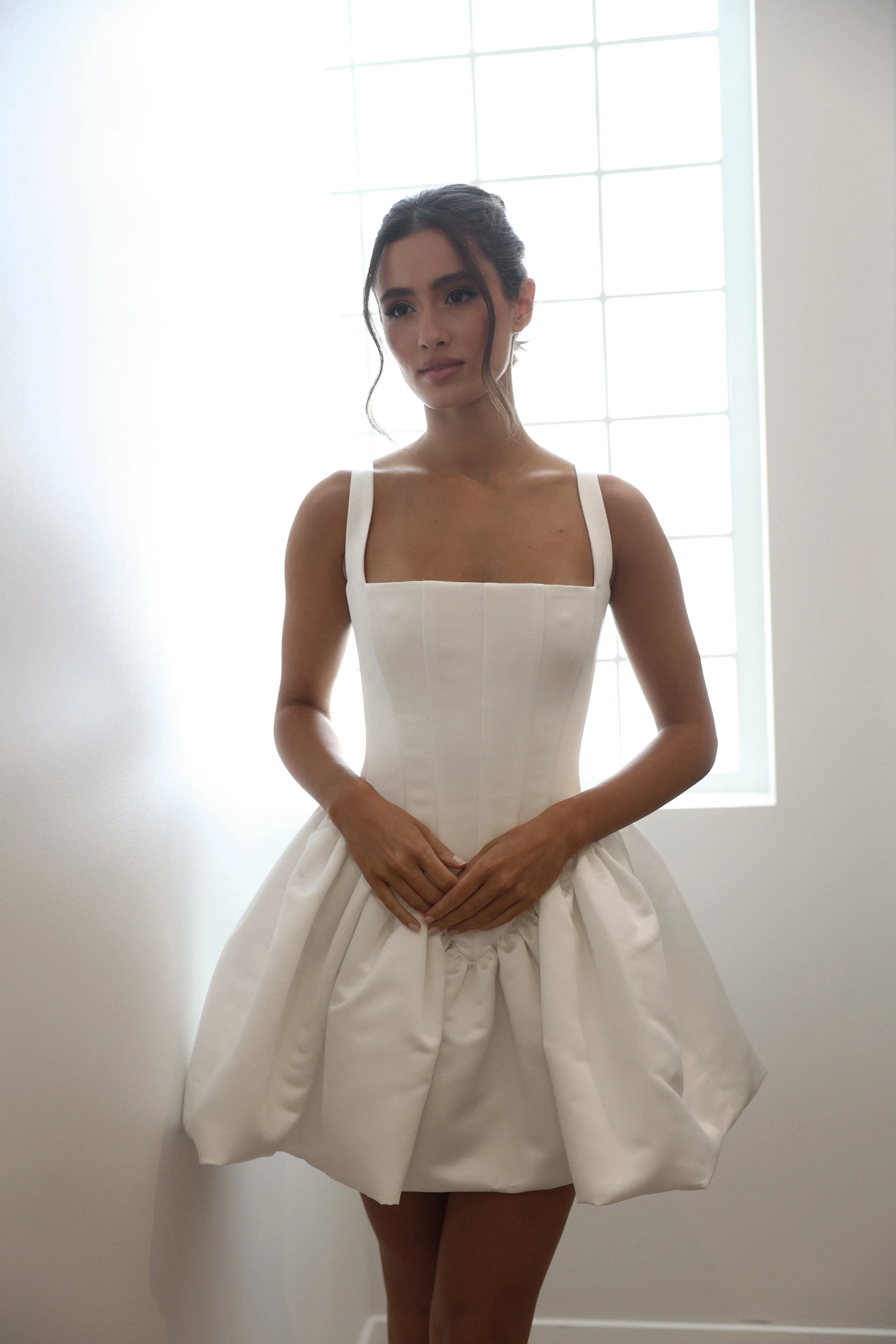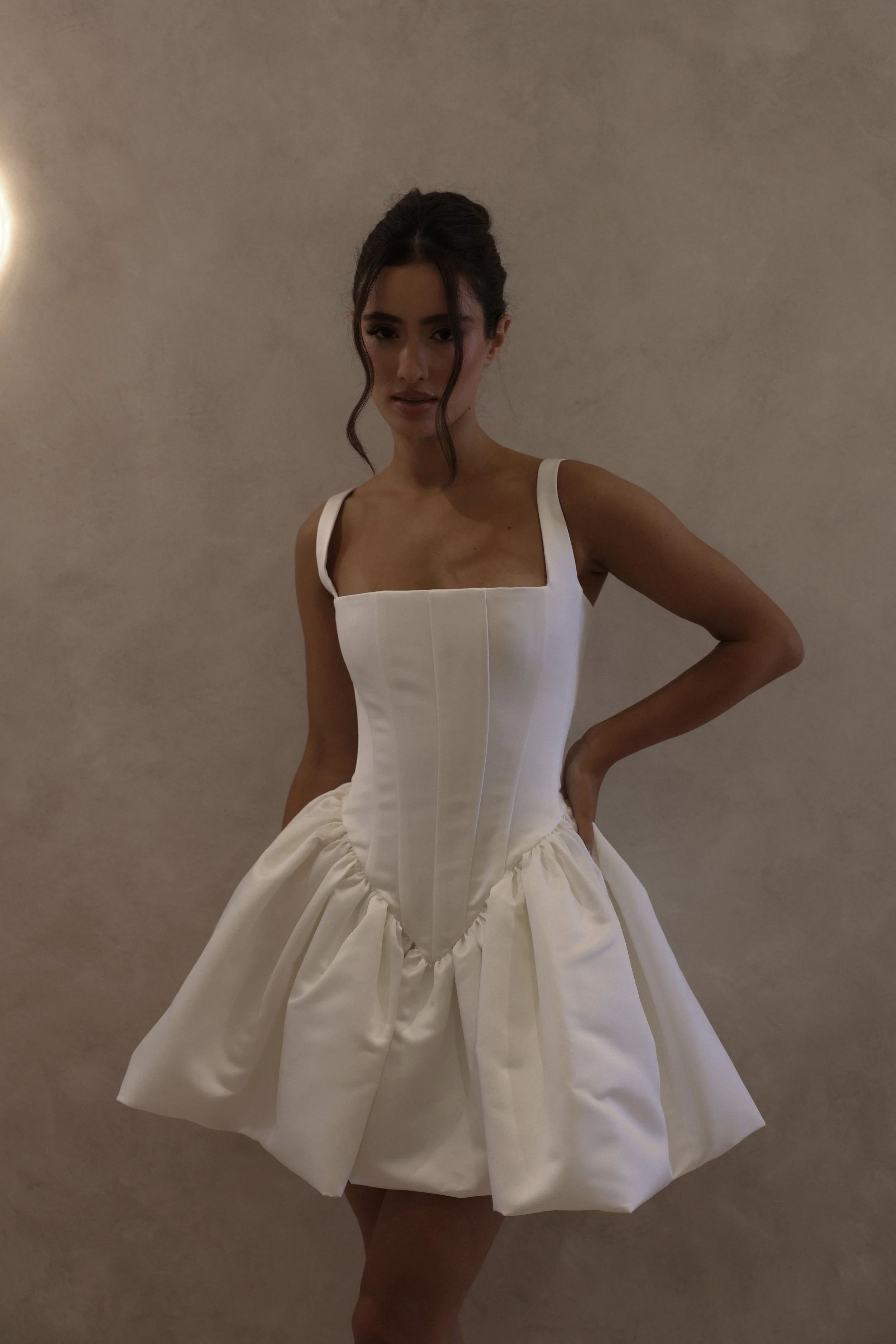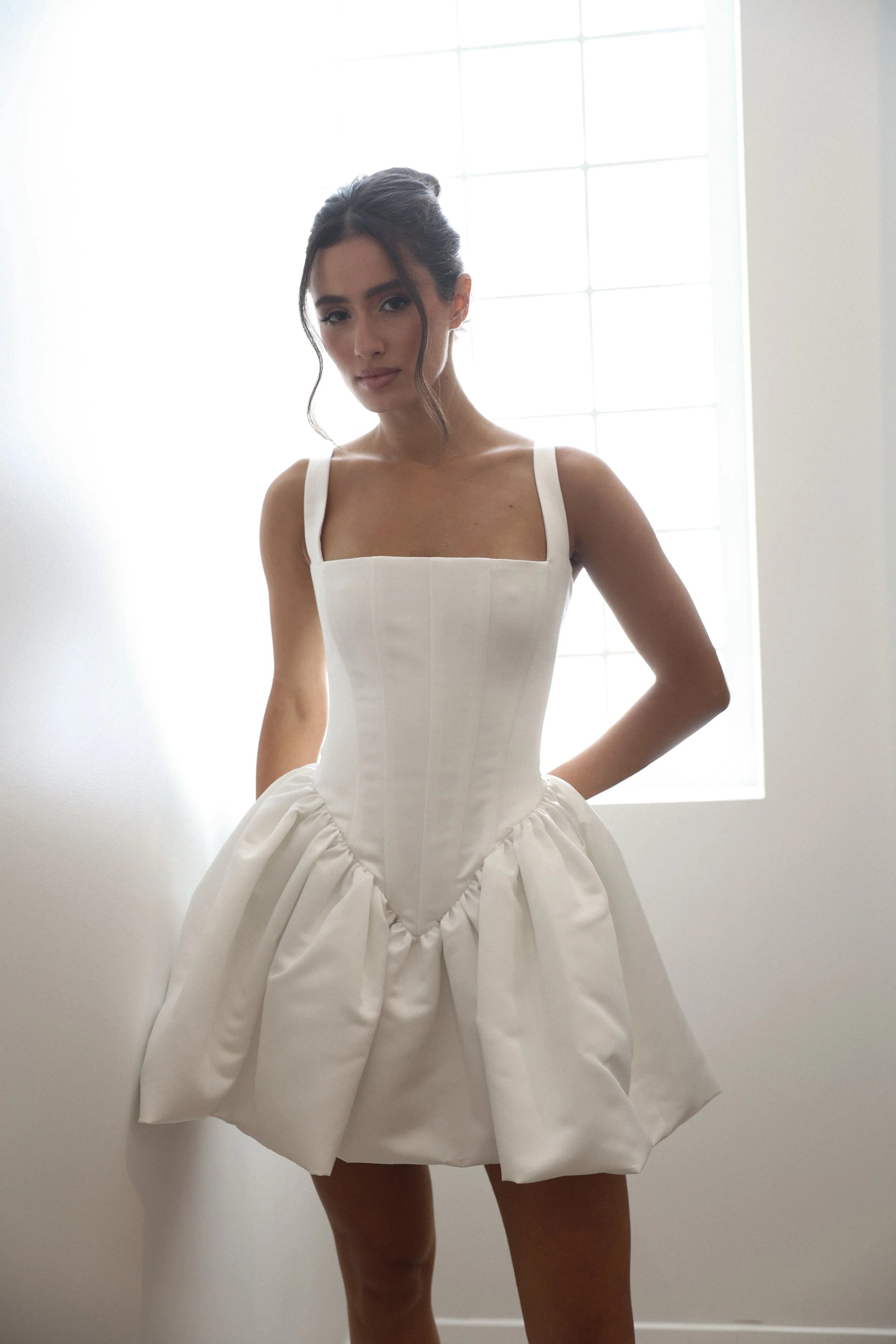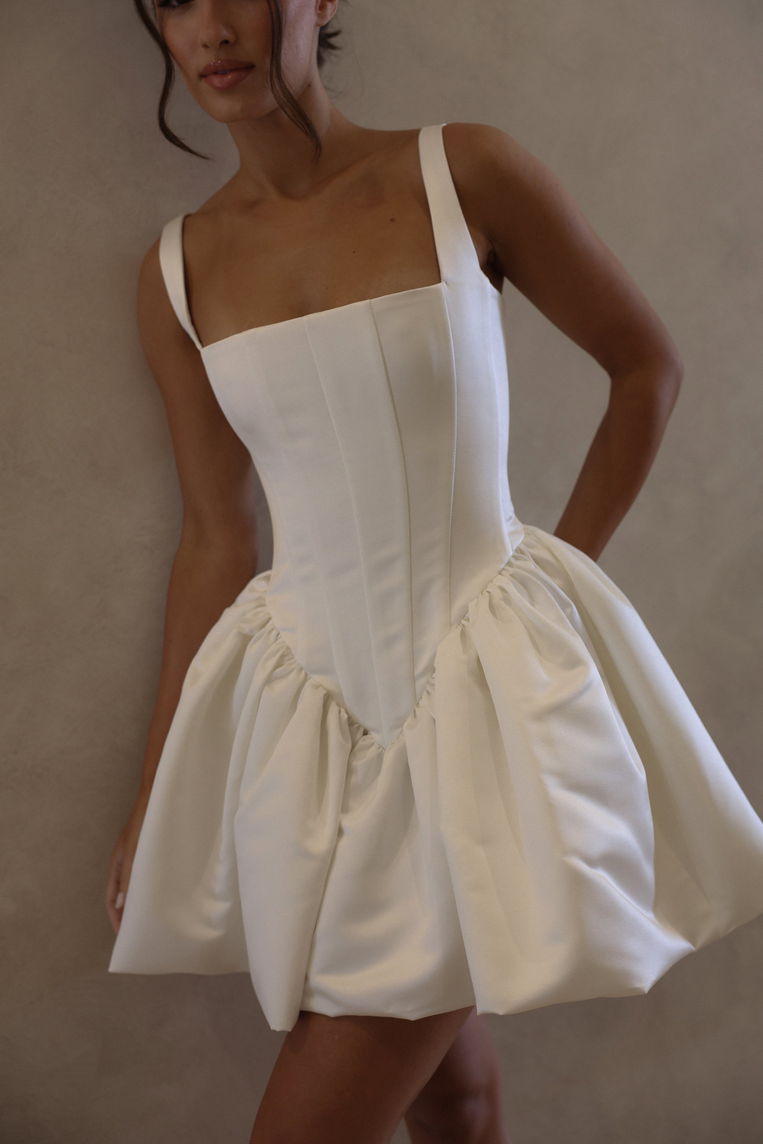 The Bonnie Dress features a chic corset top with wide straps and a voluminous cocktail mini skirt, keeping a fun, elegant silhouette for various occasions.