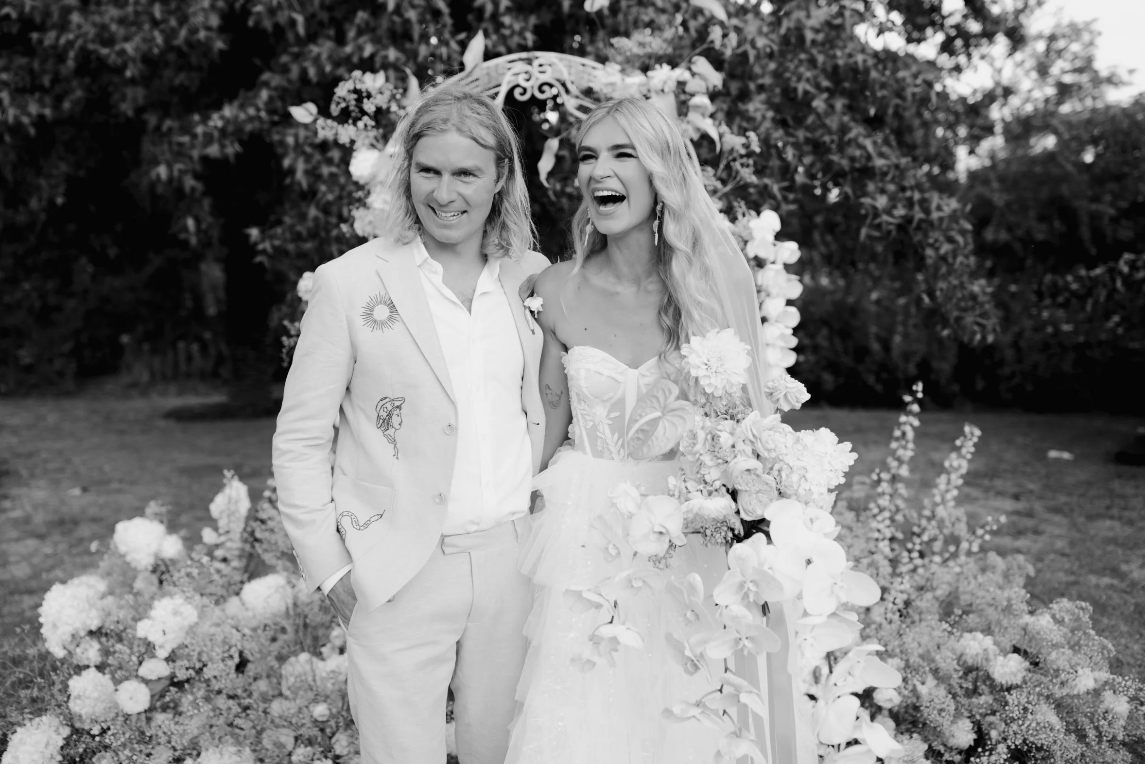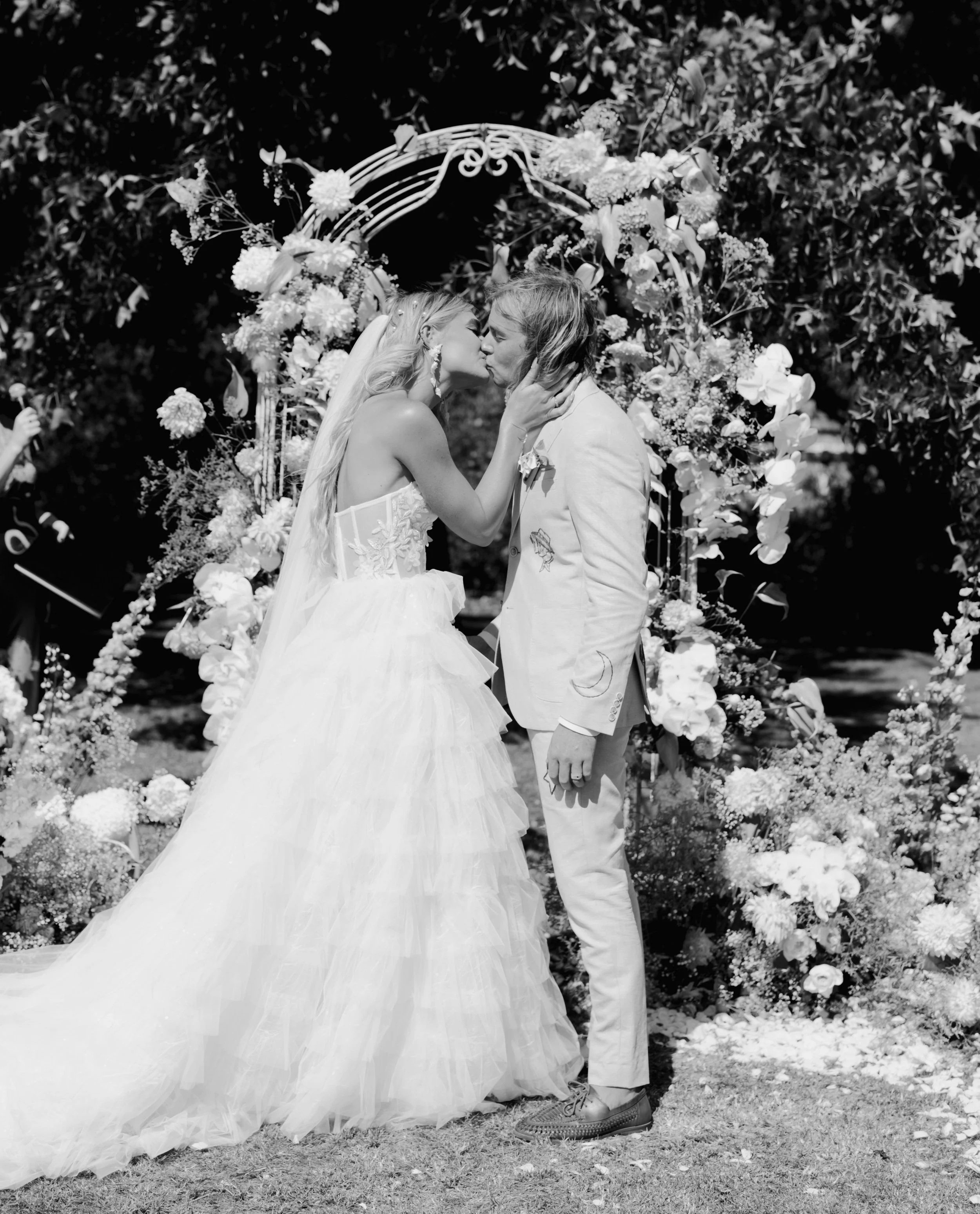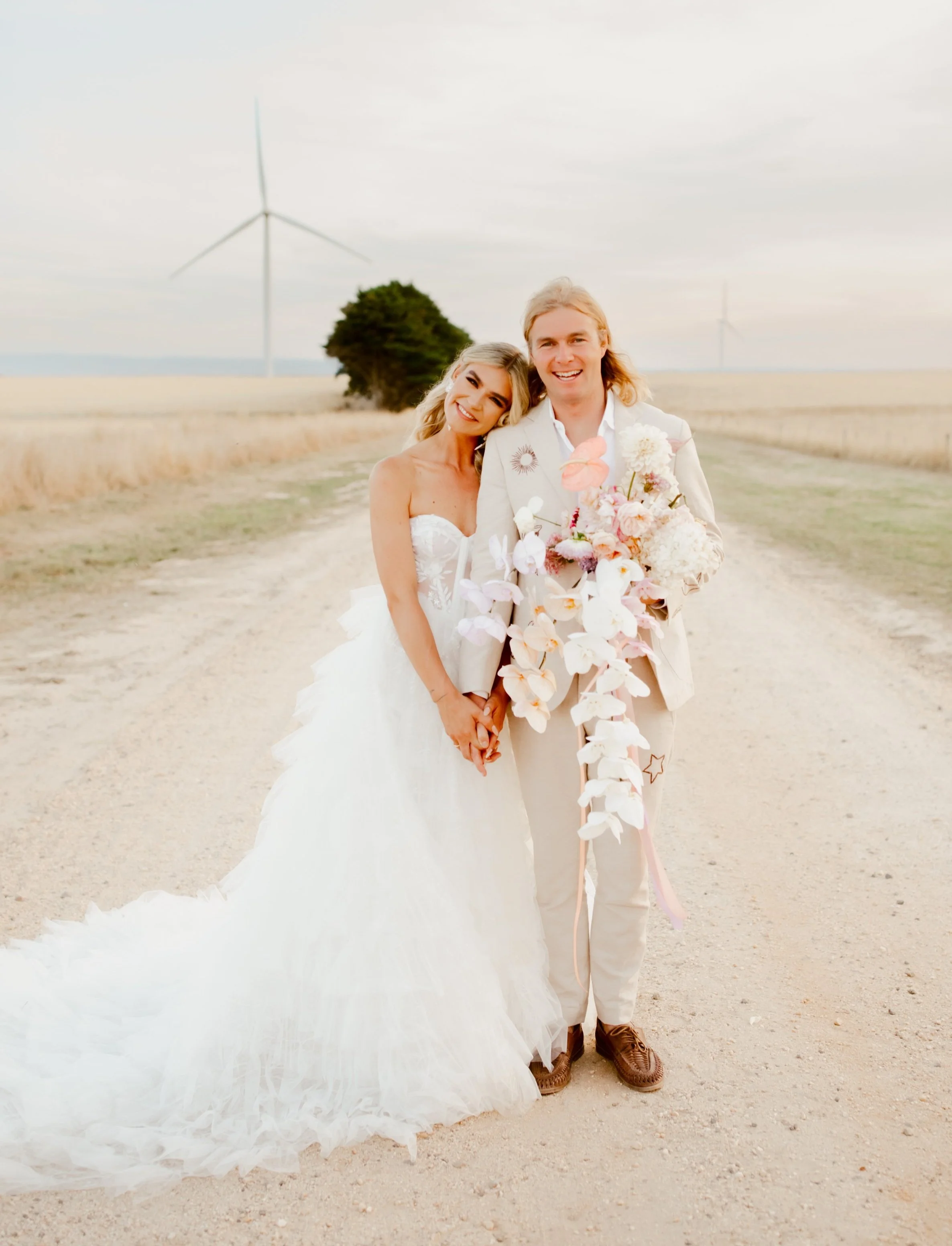An eclectic country wedding spilling with vibrant colour and chic styling for bride Amy in her Tal Kedem Singapore gown. A whimsical, feminine strapless princess ball gown silhouette for the bride looking to make a statement. Featuring a fashionable sheer bustier adorned with intricate floral and leaf beadwork and a voluminous tulle ruffle skirt and dramatic train. Available in our Sydney gallery.