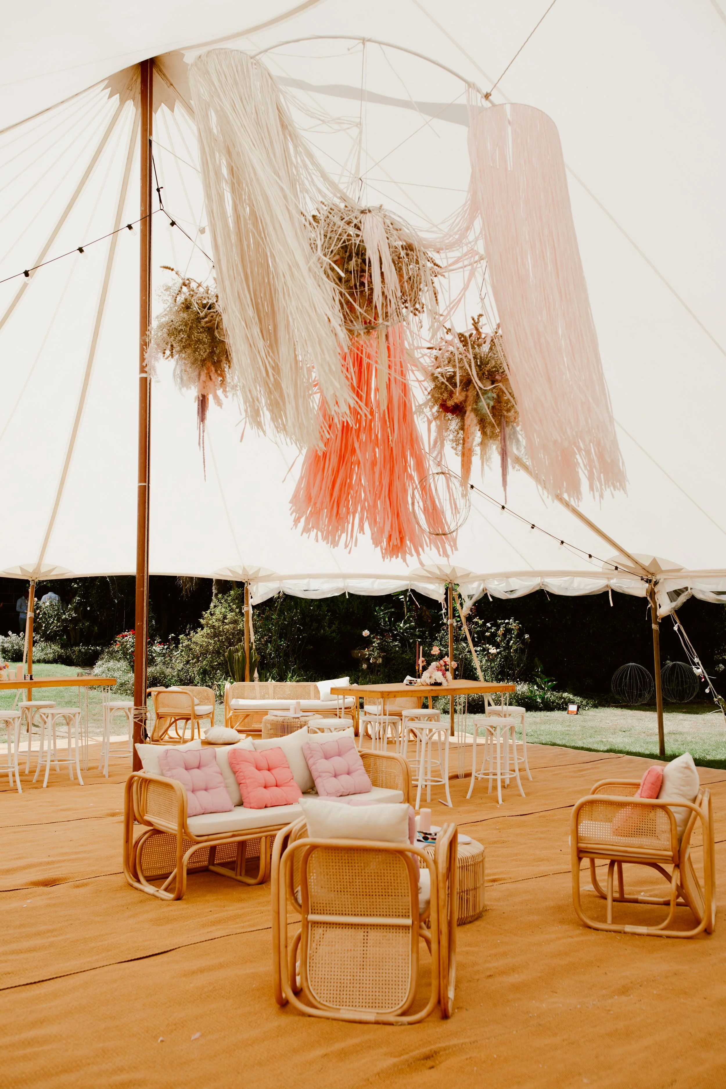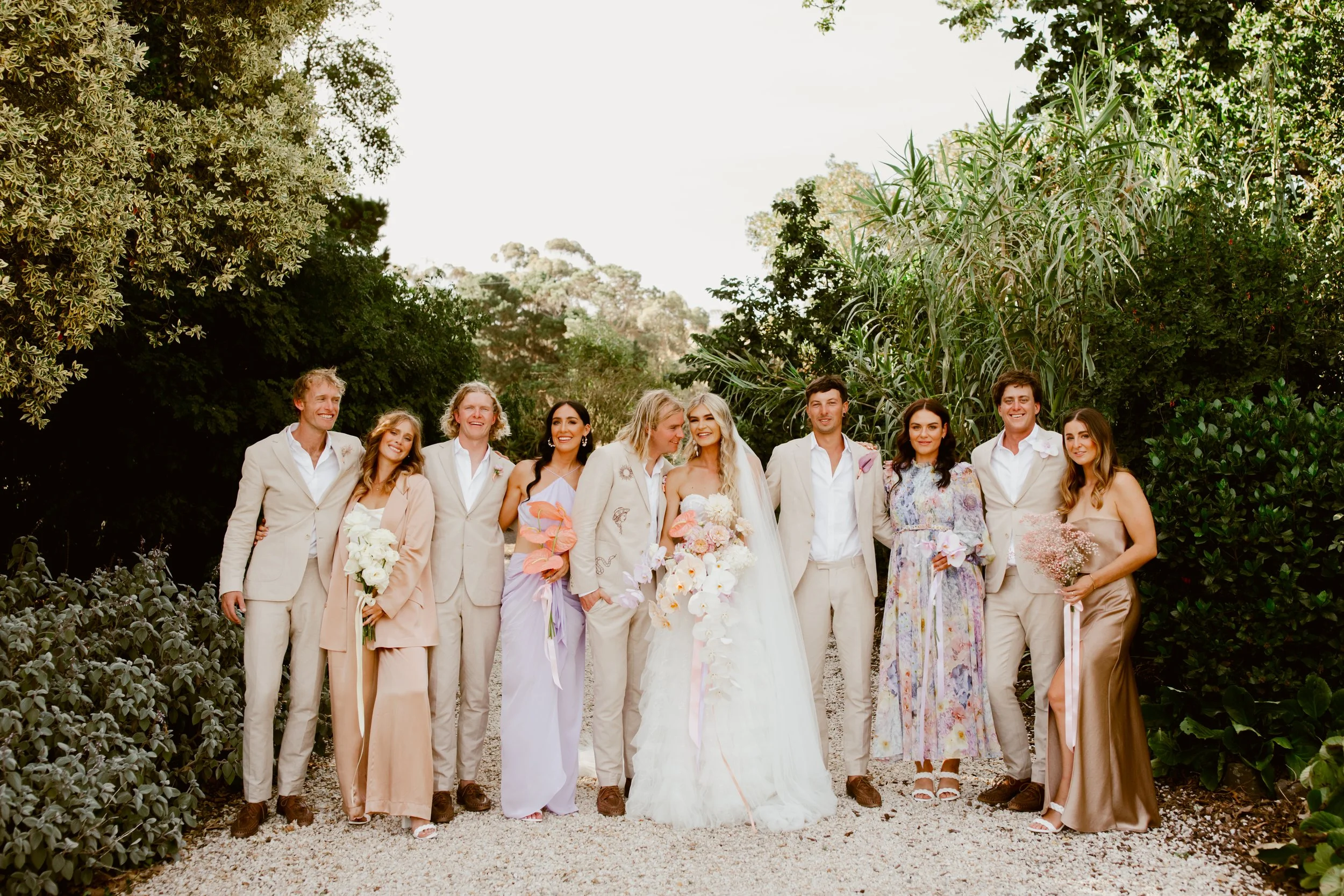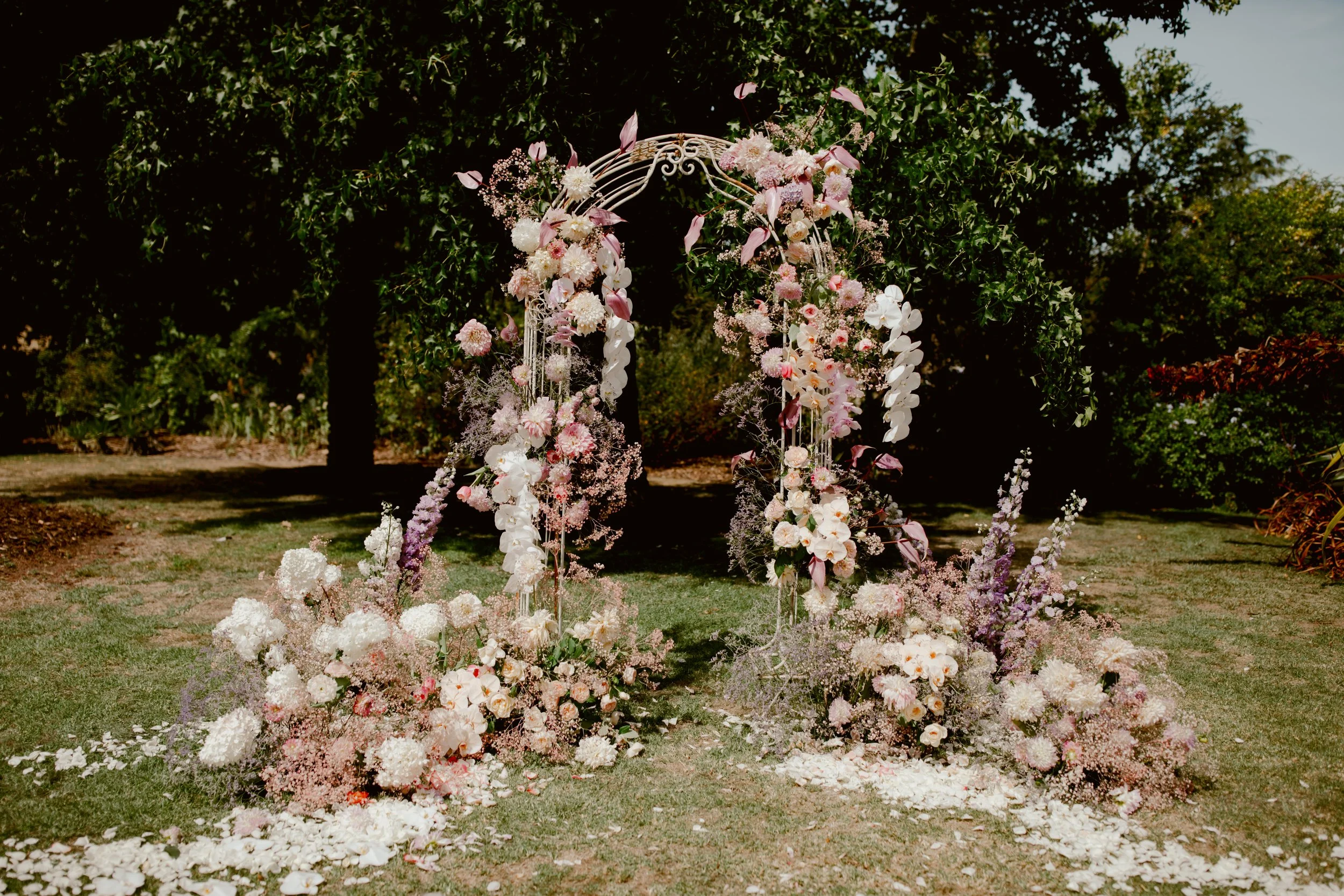 An eclectic country wedding spilling with vibrant colour and chic styling for bride Amy in her Tal Kedem Singapore gown. A whimsical, feminine strapless princess ball gown silhouette for the bride looking to make a statement. Featuring a fashionable sheer bustier adorned with intricate floral and leaf beadwork and a voluminous tulle ruffle skirt and dramatic train. Available in our Sydney gallery.