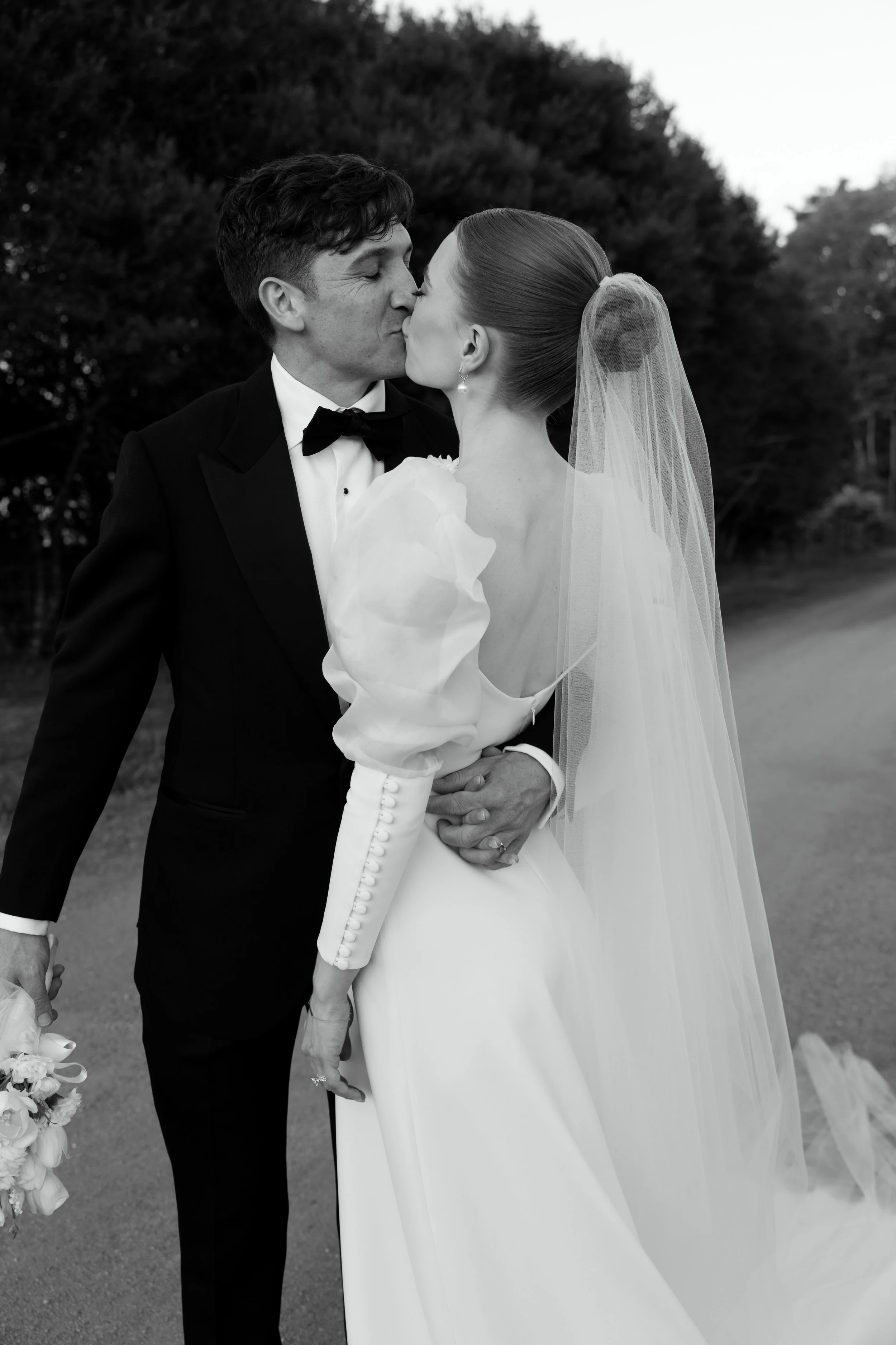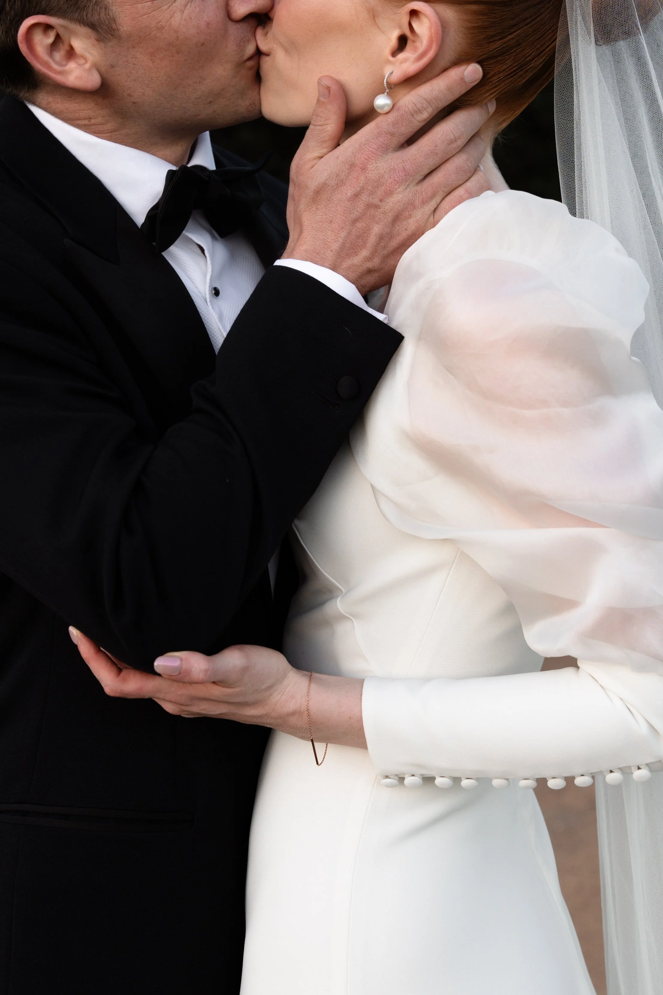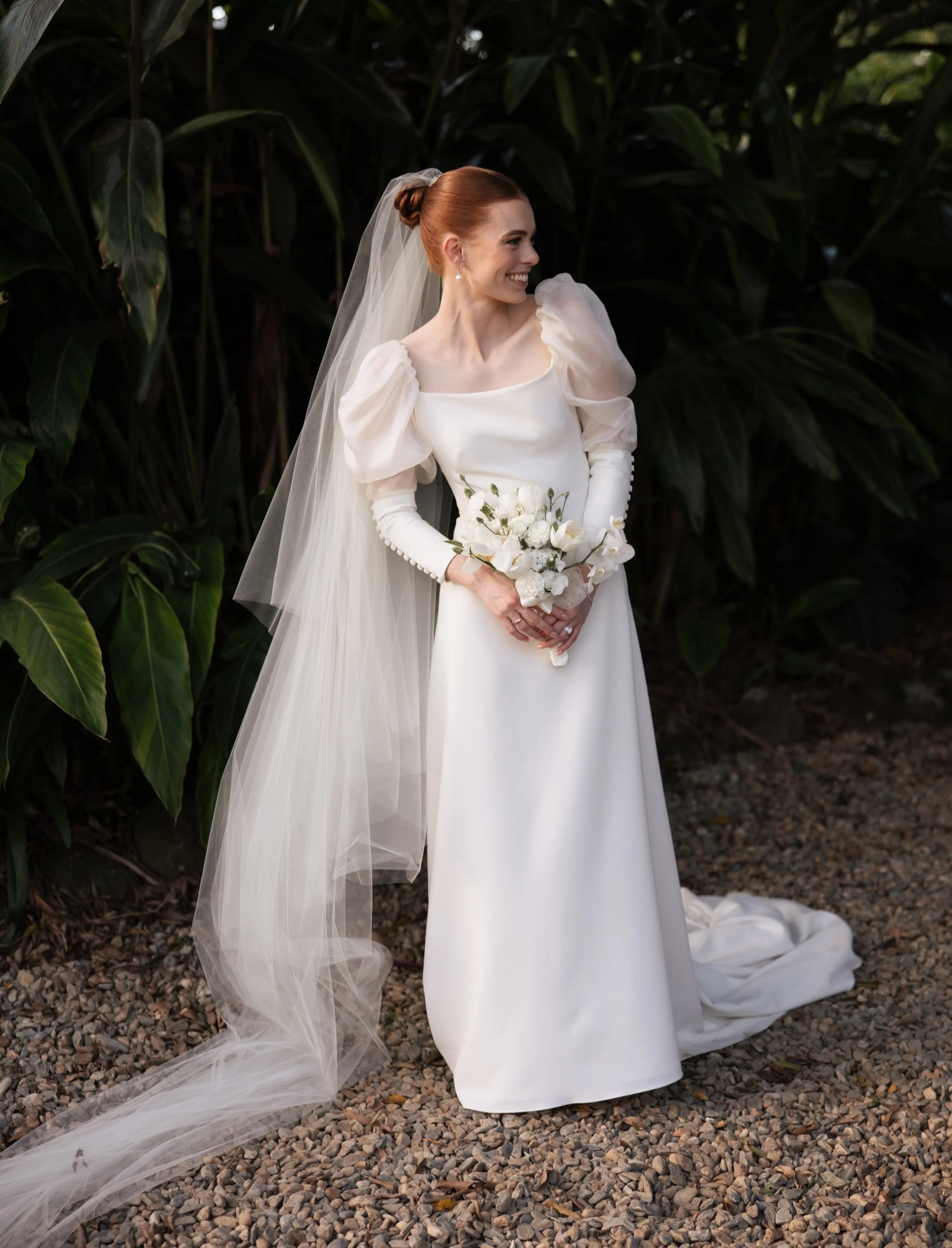 A wedding of poetic romance and modernity amongst a lush garden estate with bride Rosie adorning two chic Sophie et Voila styles. A vintage inspired silhouette for ceremony, the Sophie et Voila Guru gown with billowing featherlight sleeves and classic button-up cuffs, and an iconic statement look come evening in the Sophie et Voila Dune mini. Both available at Sphere Bridal Gallery, Sydney.