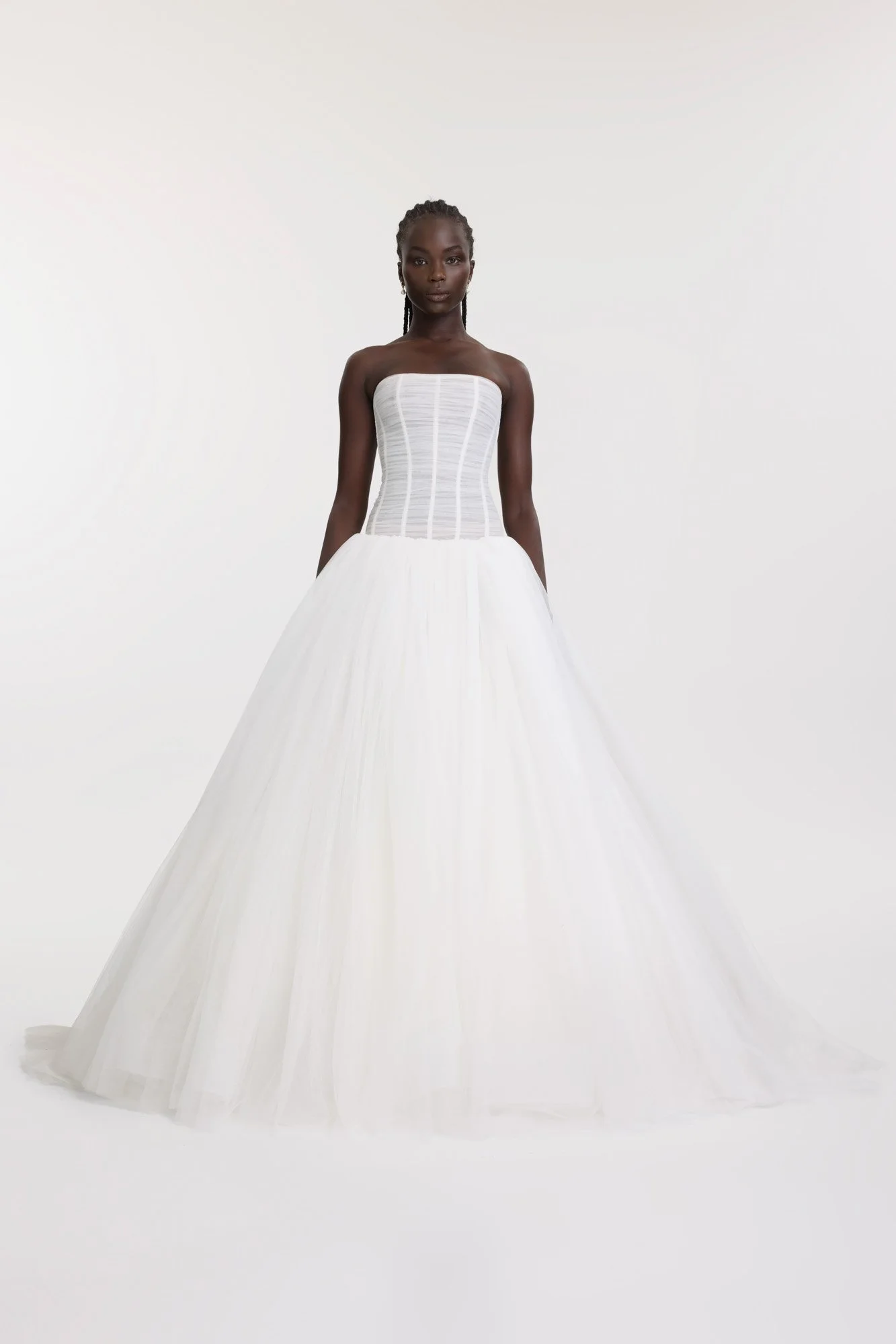 Dropped waist fitted gown with full tulle skirt. Boned through bodice. Centre back zip with buttons and loops. Bright ivory tulle. Nude tulle lining (as per images) or lined in bright ivory lining. Note: if lined in bright ivory contrast details of tulle and boning will be lost.