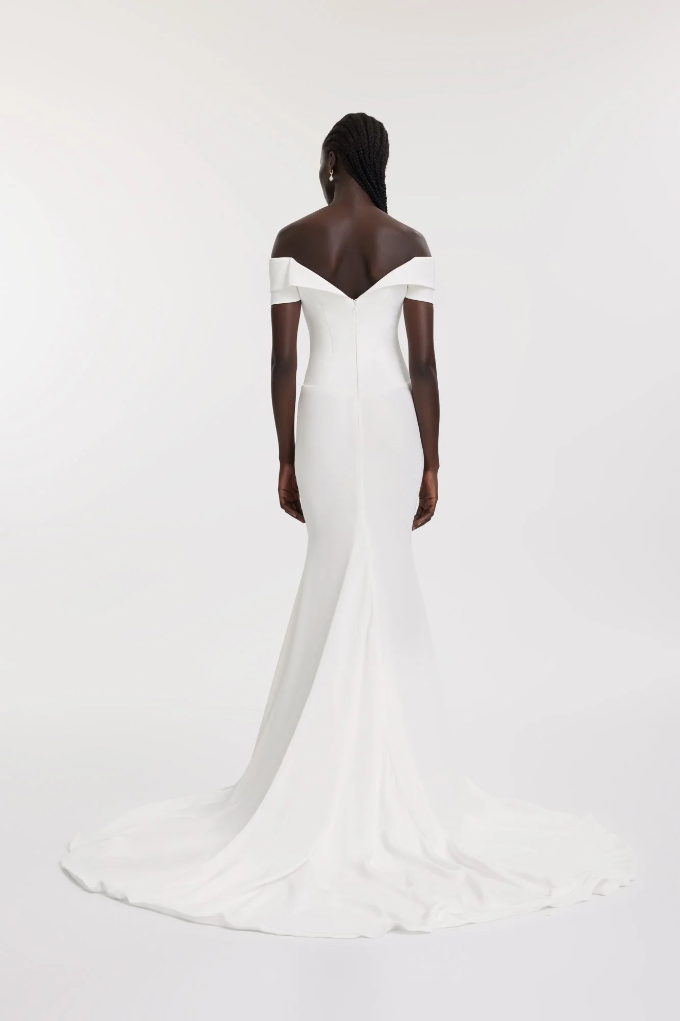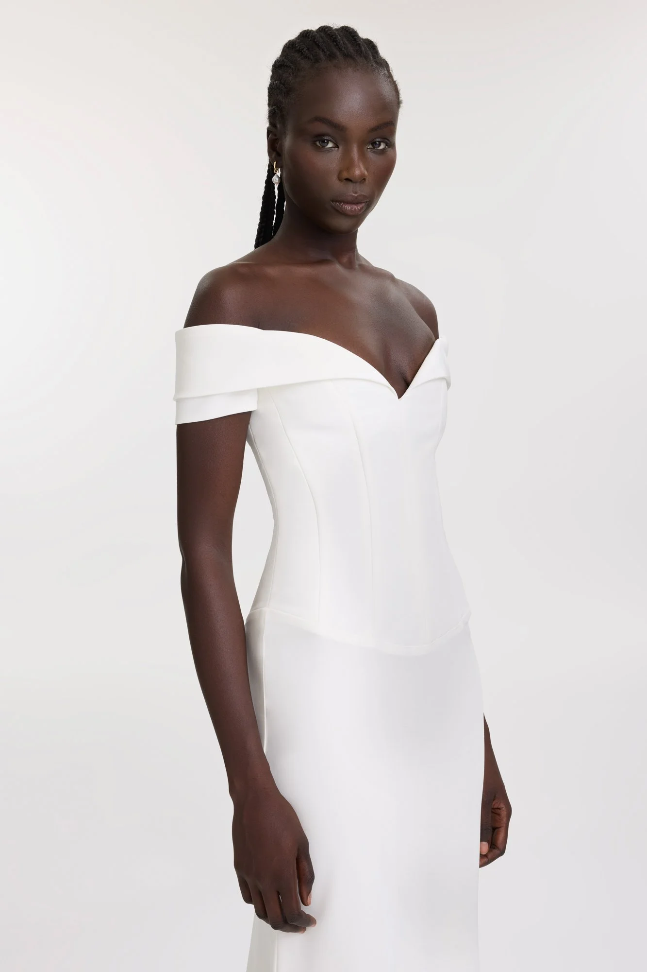 Structured bodice with boning, dropped waist detail and a fitted skirt. If between sizes, size up. Matte triacetate. Centre back zip. Bright ivory.