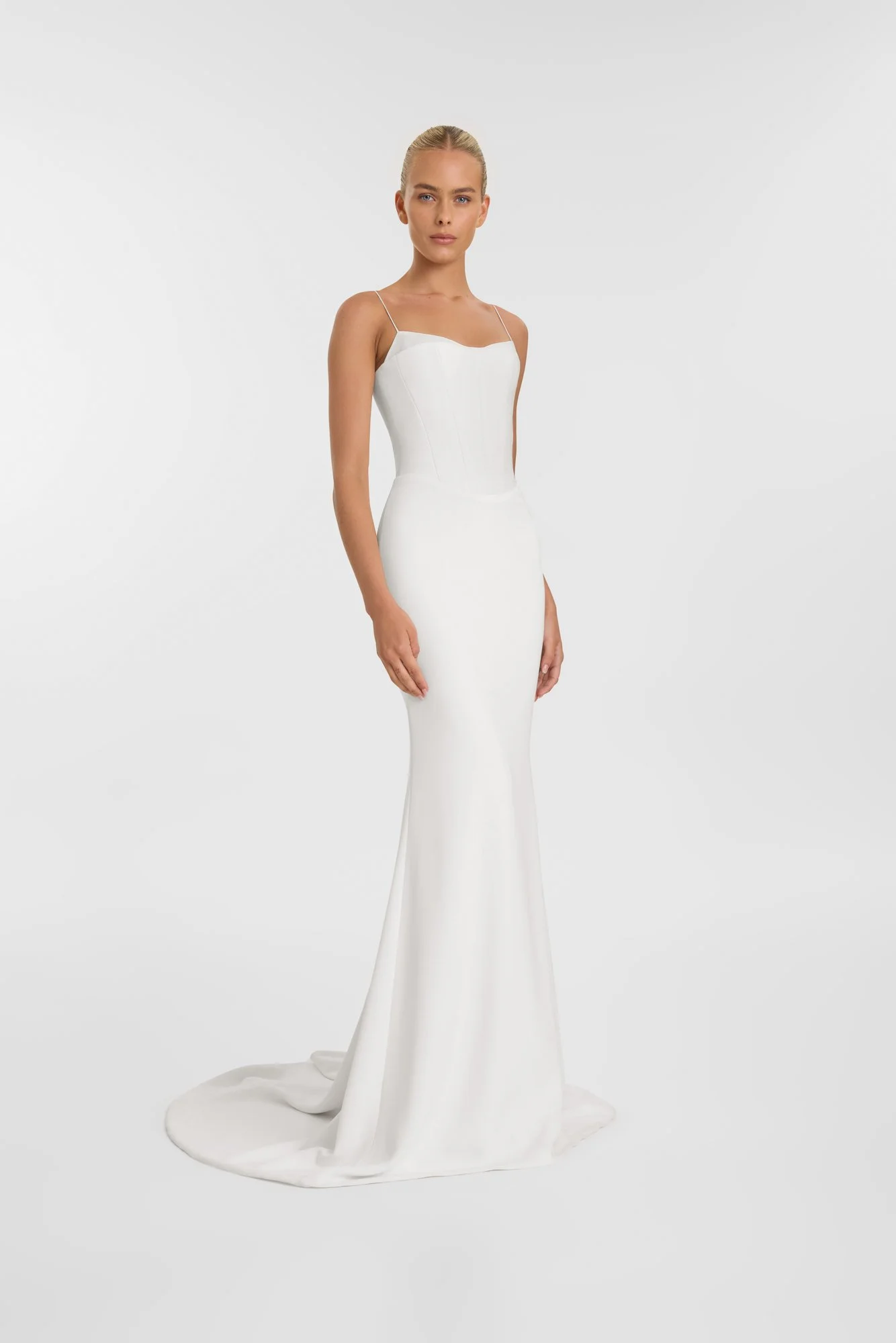 Fit and flare gown with structured bodice, straight neckline with chiffon spaghetti strap layer. Centre back zip, hook and eye on bodice. Matte crepe main with chiffon strap detail, satin lining. Bright Ivory