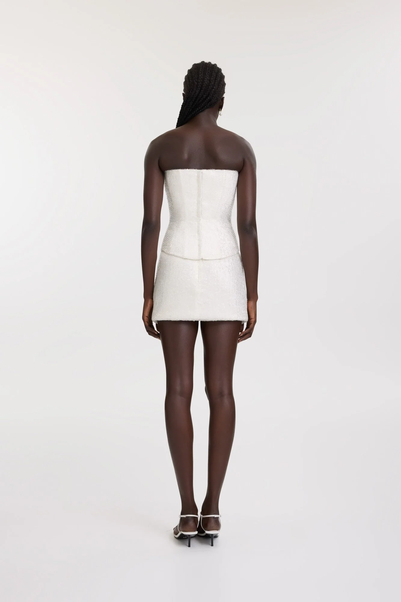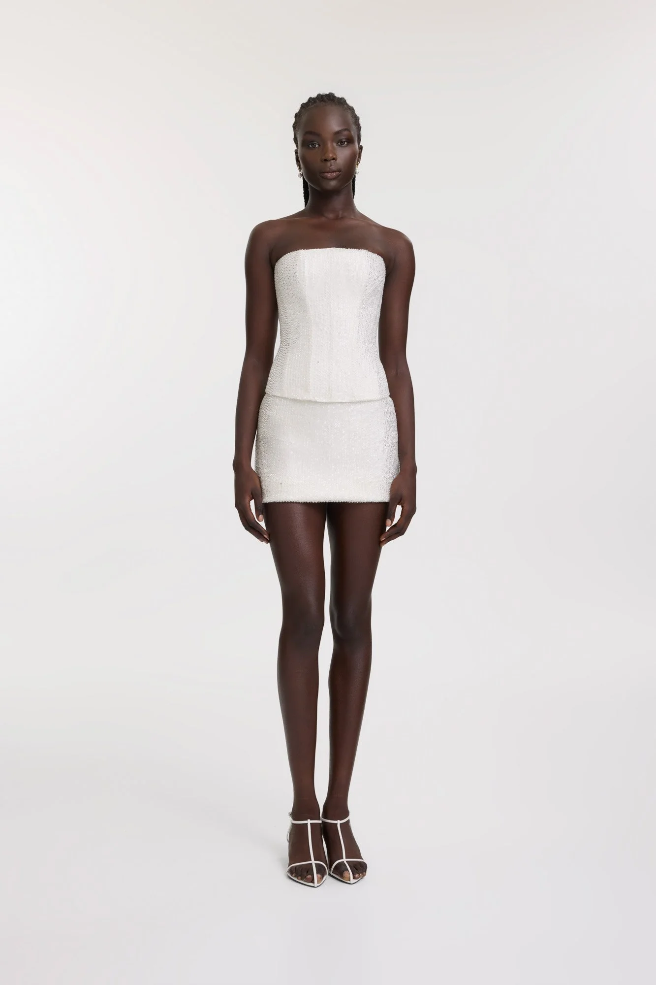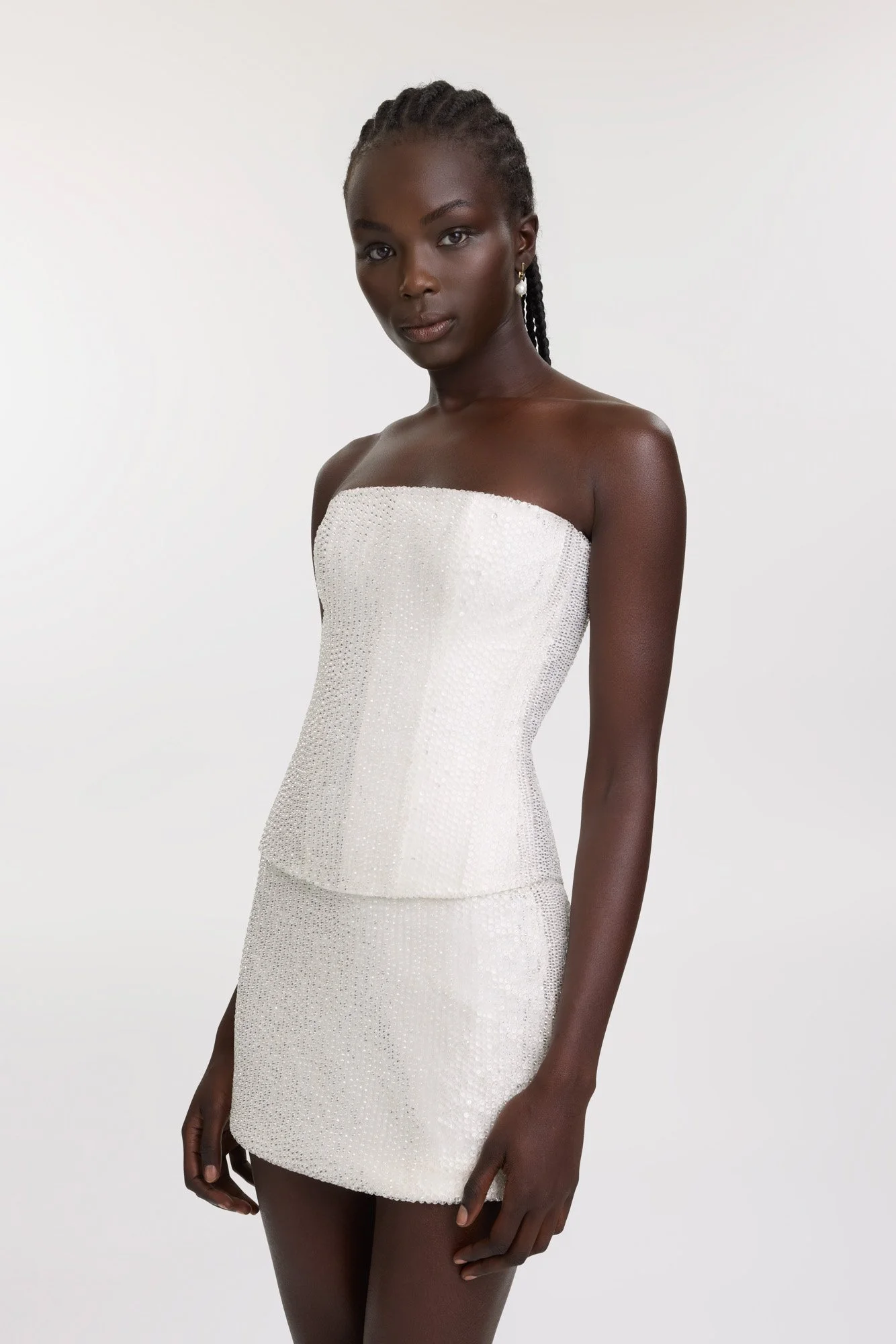 Fête-ready in the shimmering Pearson Corset. Crafted from bespoke embellished tulle, Pearson features a straight neckline and figure-sculpting drop waist. Available in midnight blue and bright ivory, pair with the Wickham Mini for a tonal triumph.