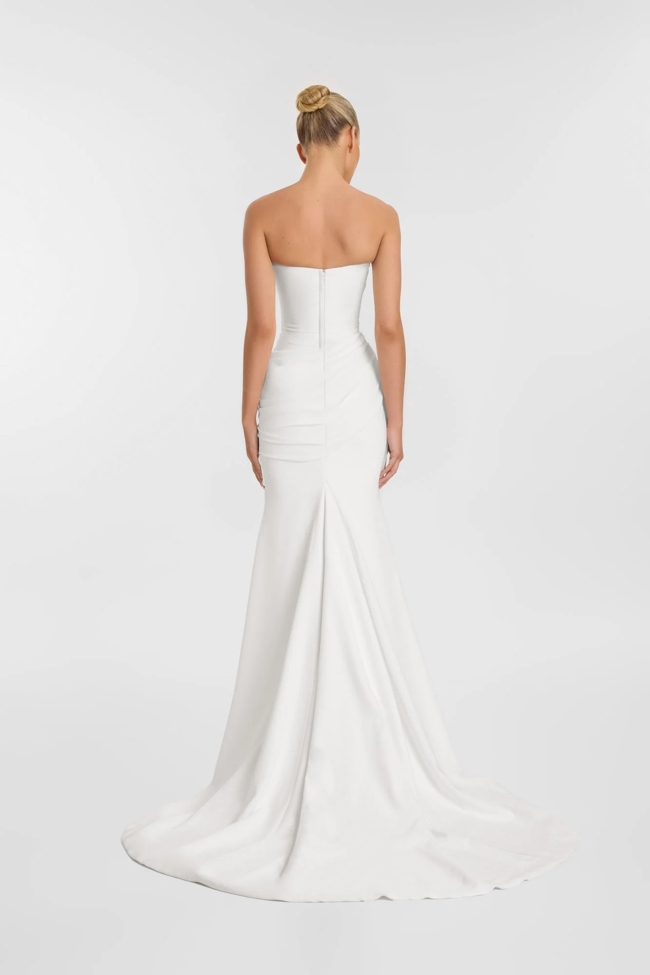 Strapless fit and flare gown with sweetheart neckline and structured bodice. Tight draping across bodice, heavier draping across skirt. Centre back zip, hook and eye on bodice. Matte crepe main, satin lining. Bright Ivory