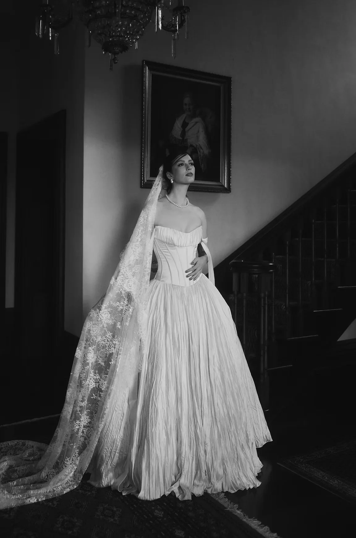 Scooped shape neckline with hand-draped details over the bust, paired with a cinched-in structured corset & drop waist style skirt in double circle hand-draped crushed pleating techniques.