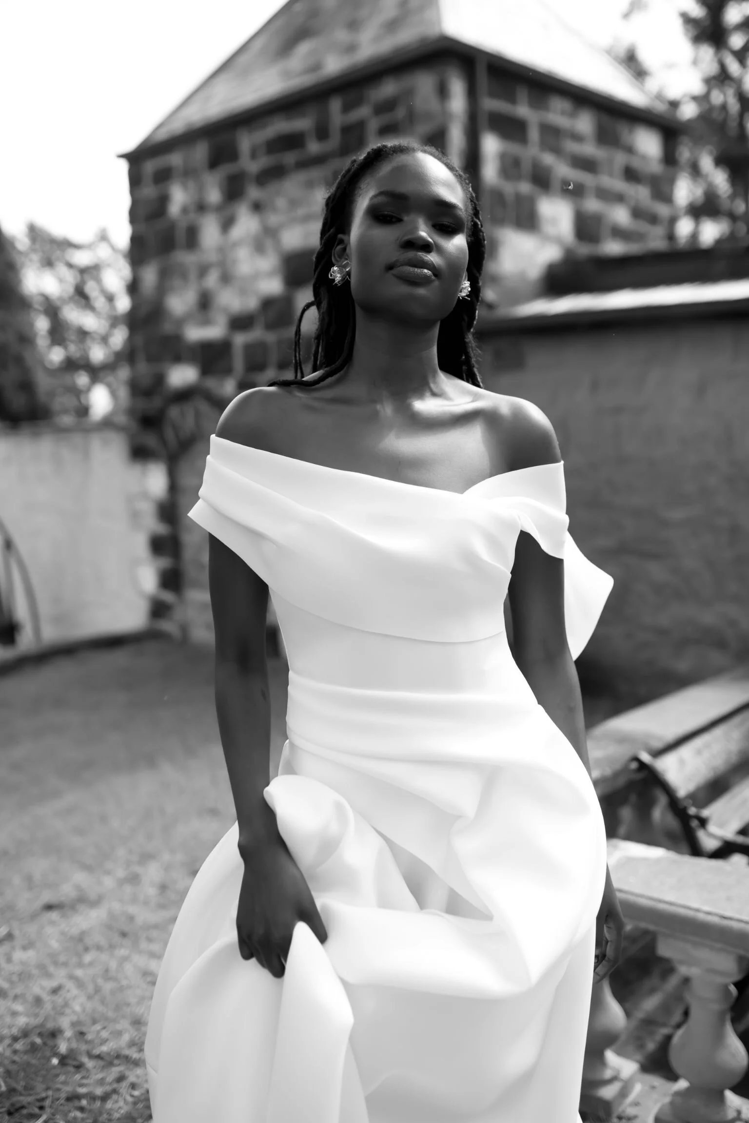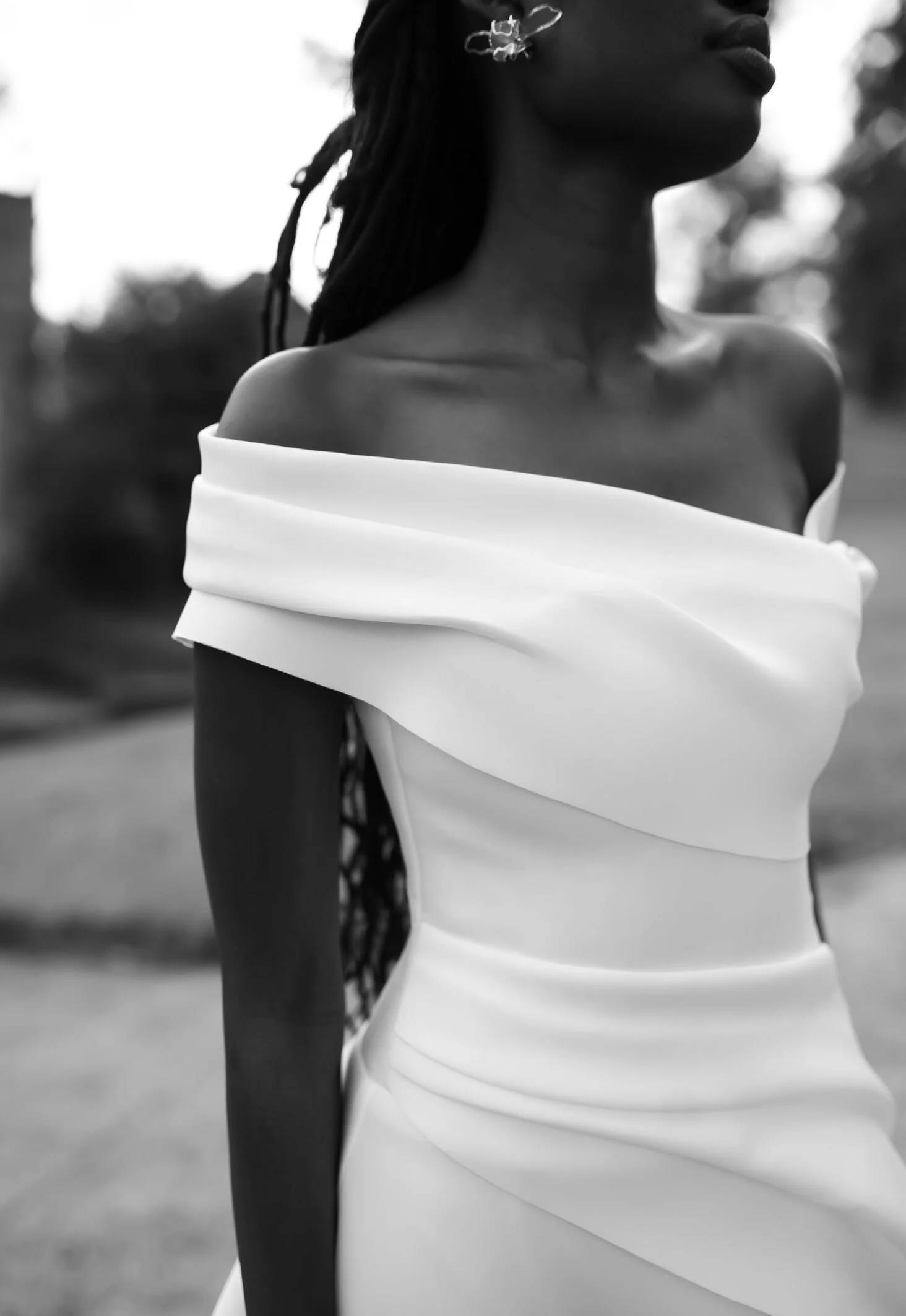 A modern approach to a classic off the shoulder ball gown style, masterfully hand-draped and cinched for a figure flattering silhouette. Featuring a dramatic sweeping train for that little bit of extra drama. Perfect for the modern romantic.