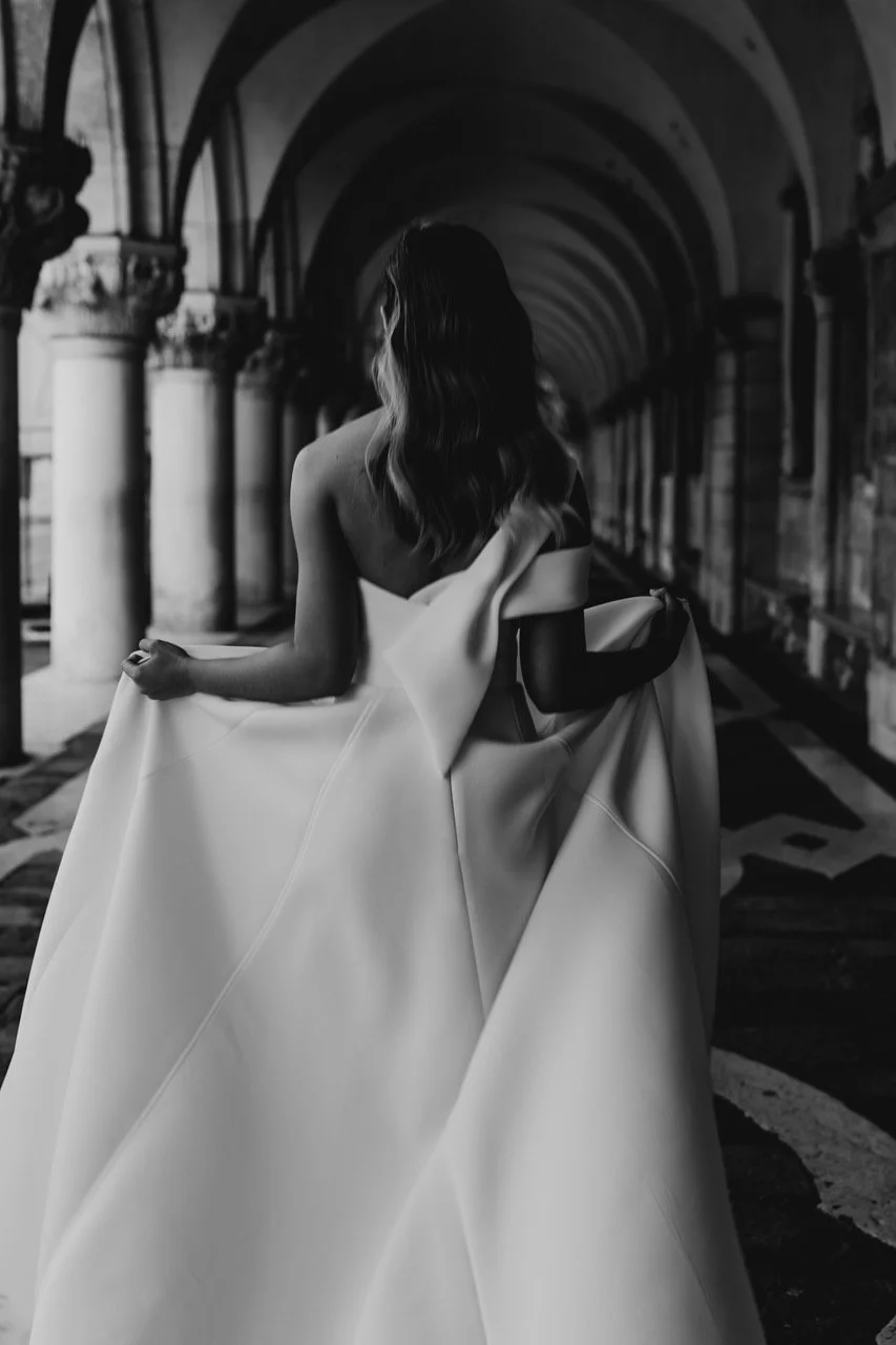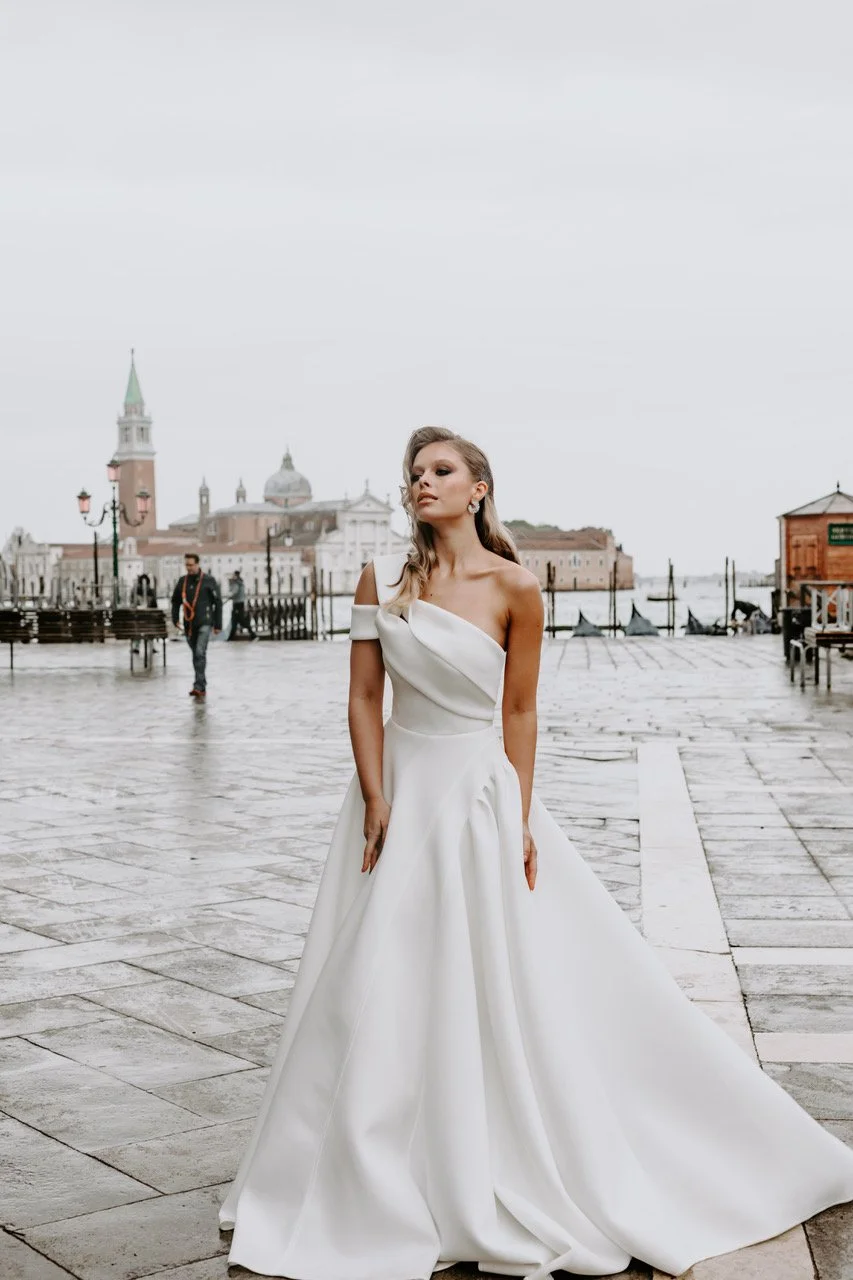 Capri is a stunning modern take on a classic ballgown. The ivory mega matte stretch fabrication is unique to Georgia Young. The structured upper bodice has a one shoulder knot feature and the soft A-line asymmetrical skirt has a full train.