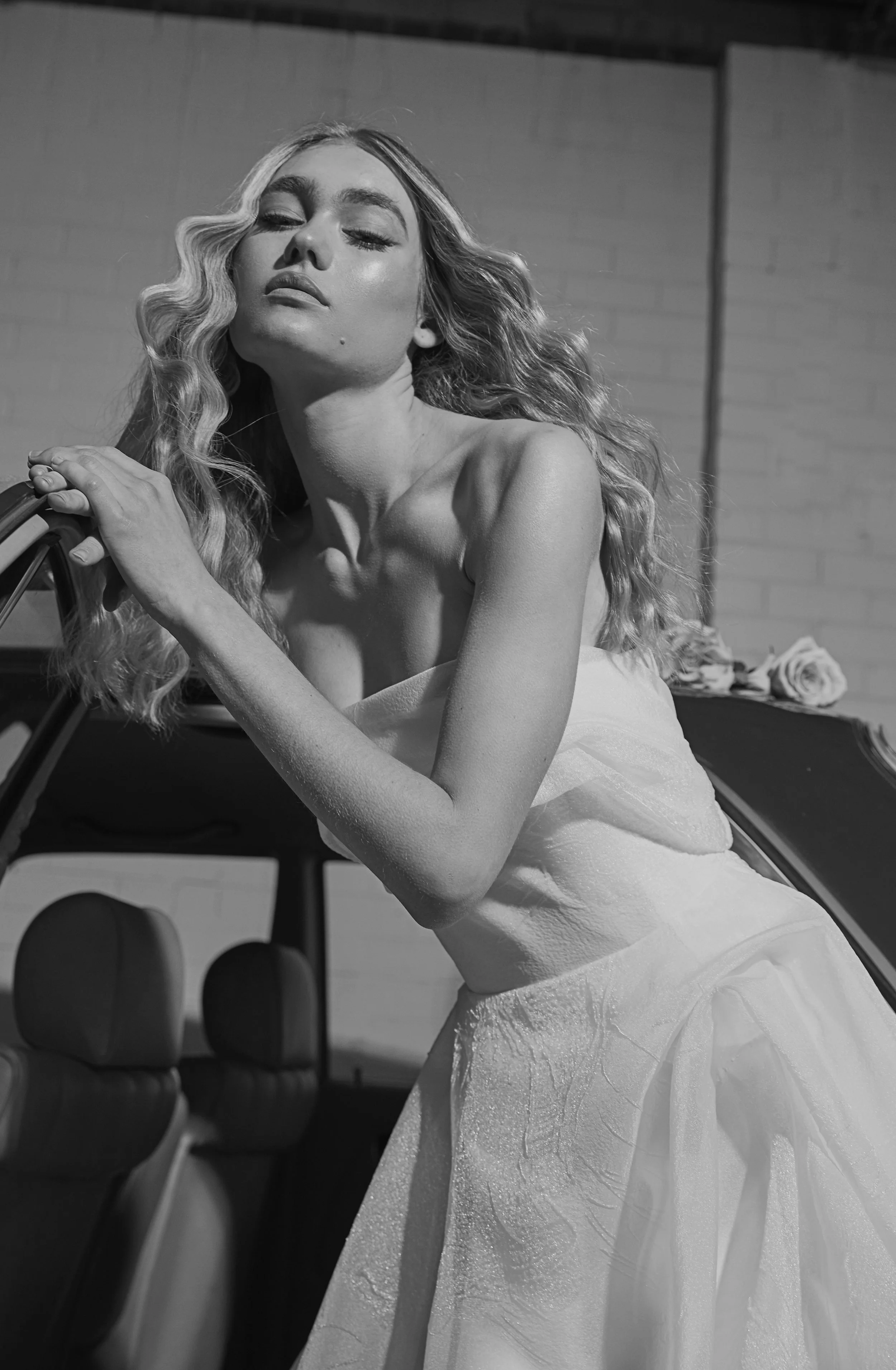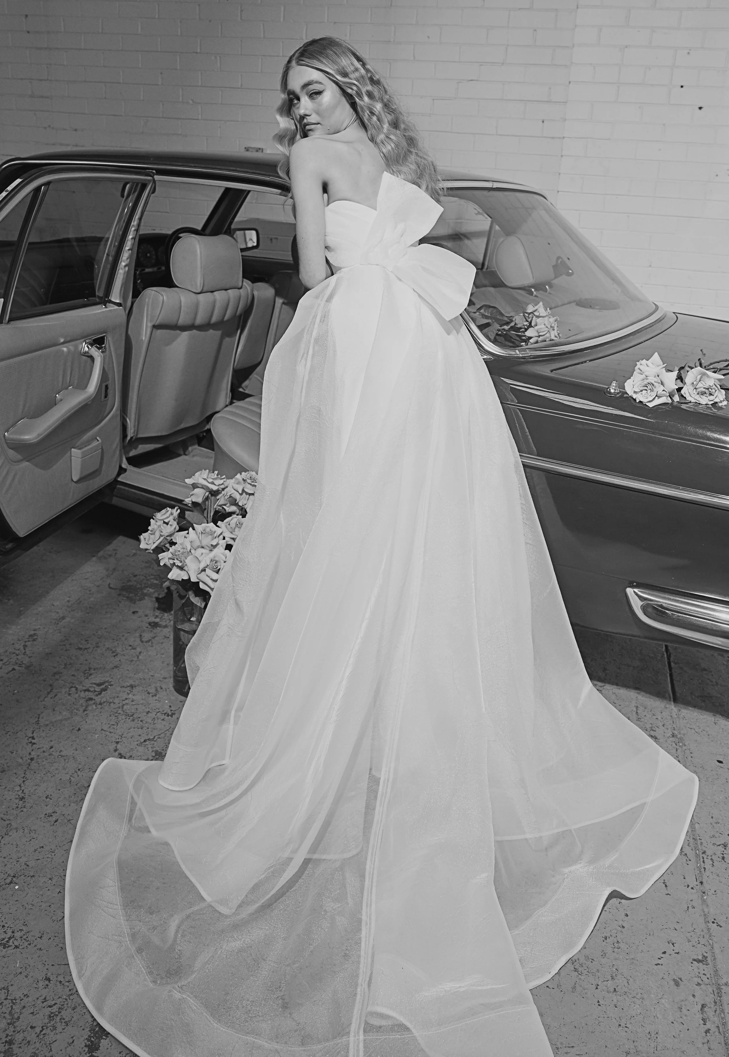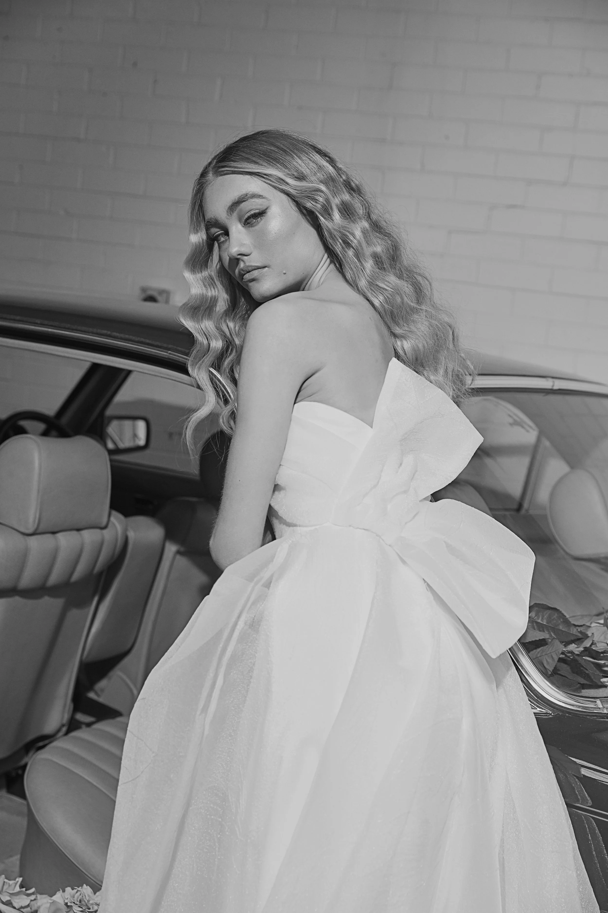 A romantic, heart fluttering silhouette for the bride looking for something soft and ethereal. The Lemon gown is crafted fro ma textured organza fabric, folded and draped into elegant forms across the bust and waist into a voluminous ball gown skirt. Finished with a statement back bow.