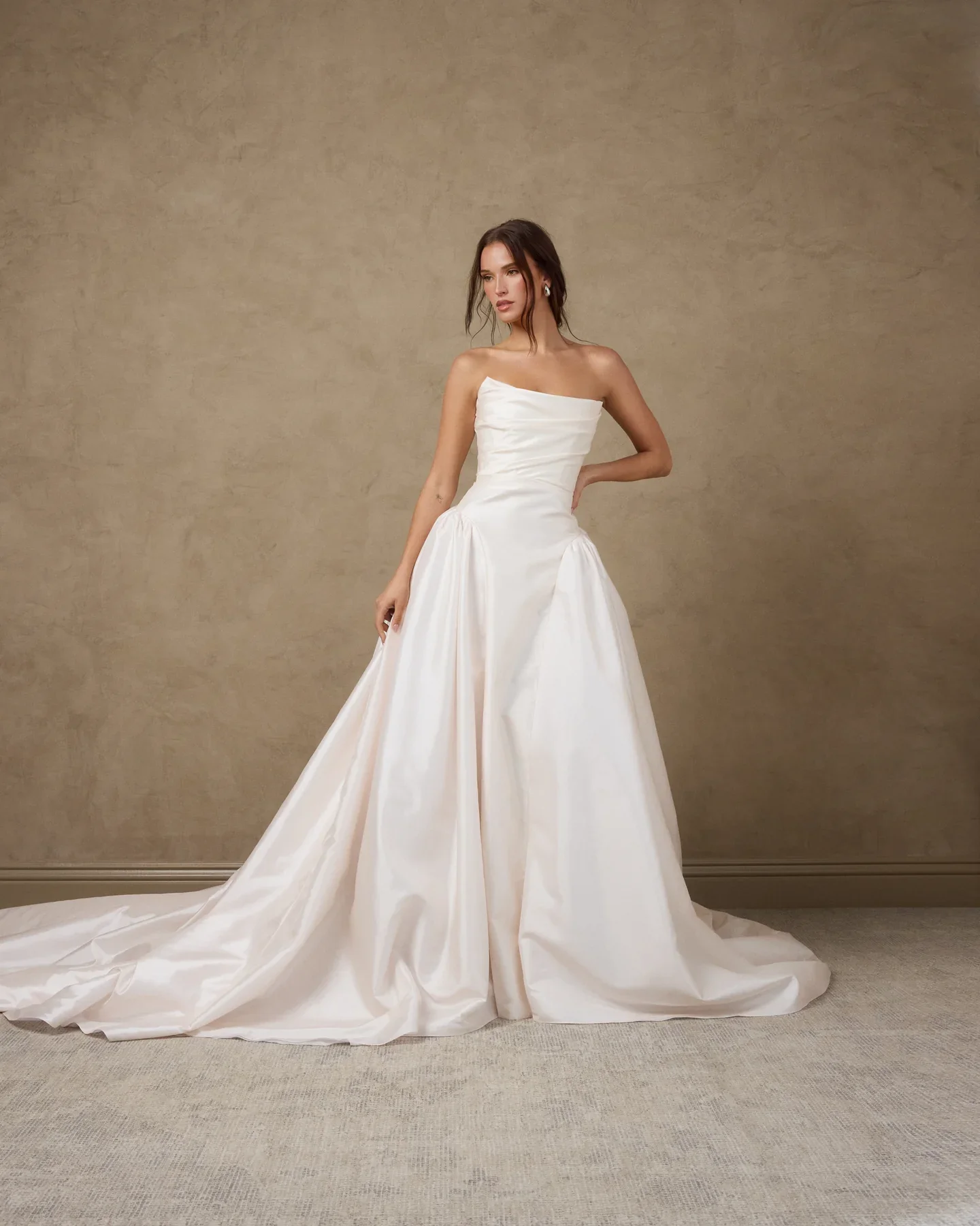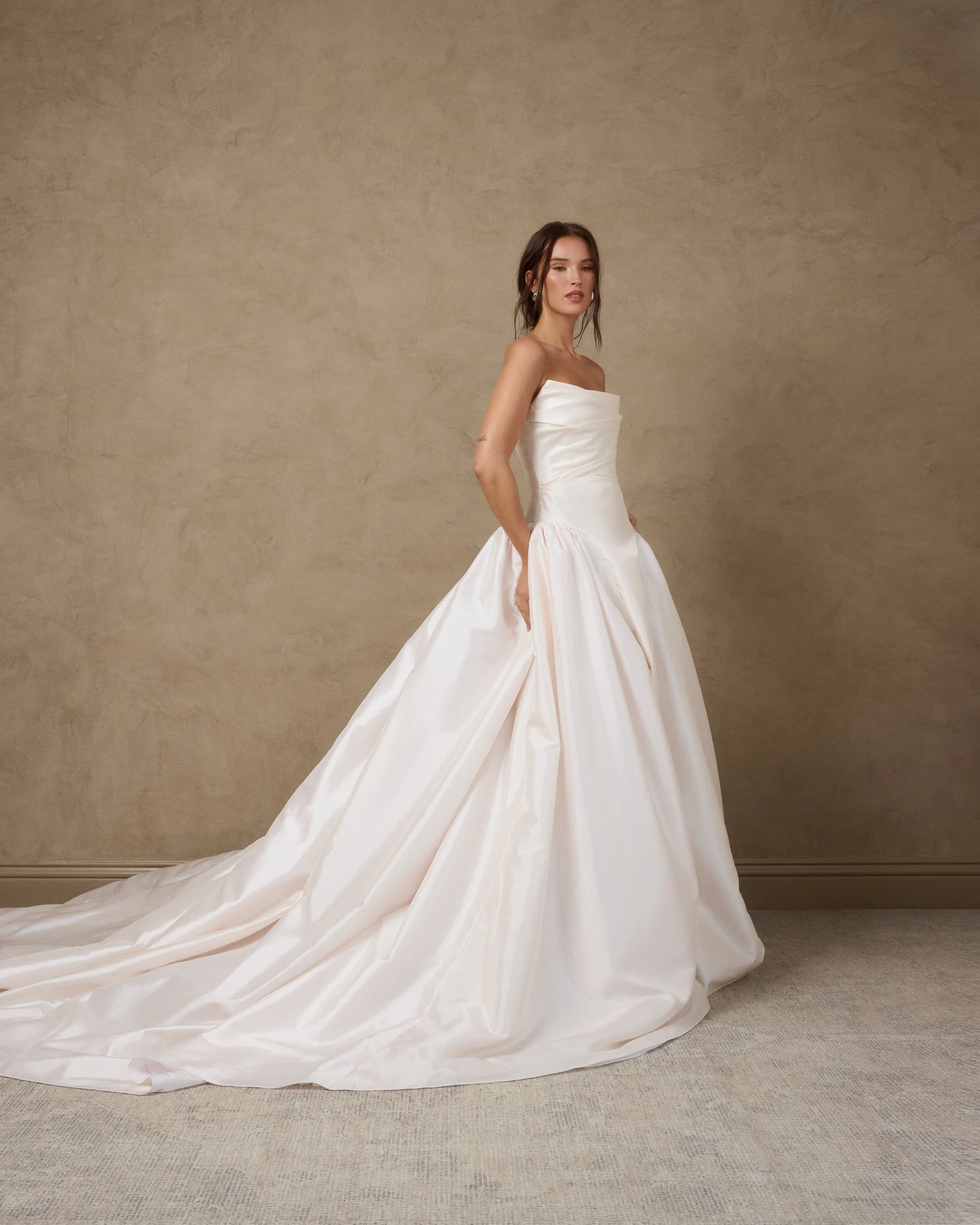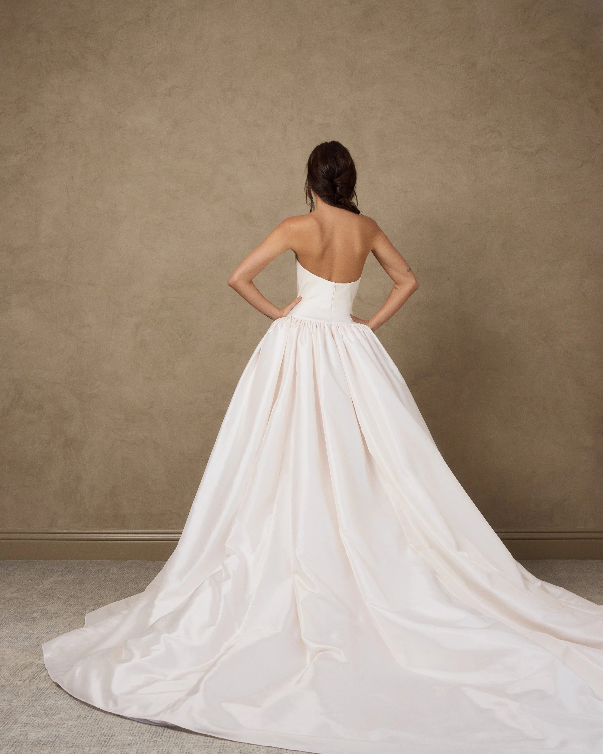 Silk taffeta ballgown with Katherine Tash’s signature draped bodice and basque waist. Features a full ballgown skirt with hand-pleated hip detail and an invisible zipper closure at the back. Available in Rose (shown) and Soft White.