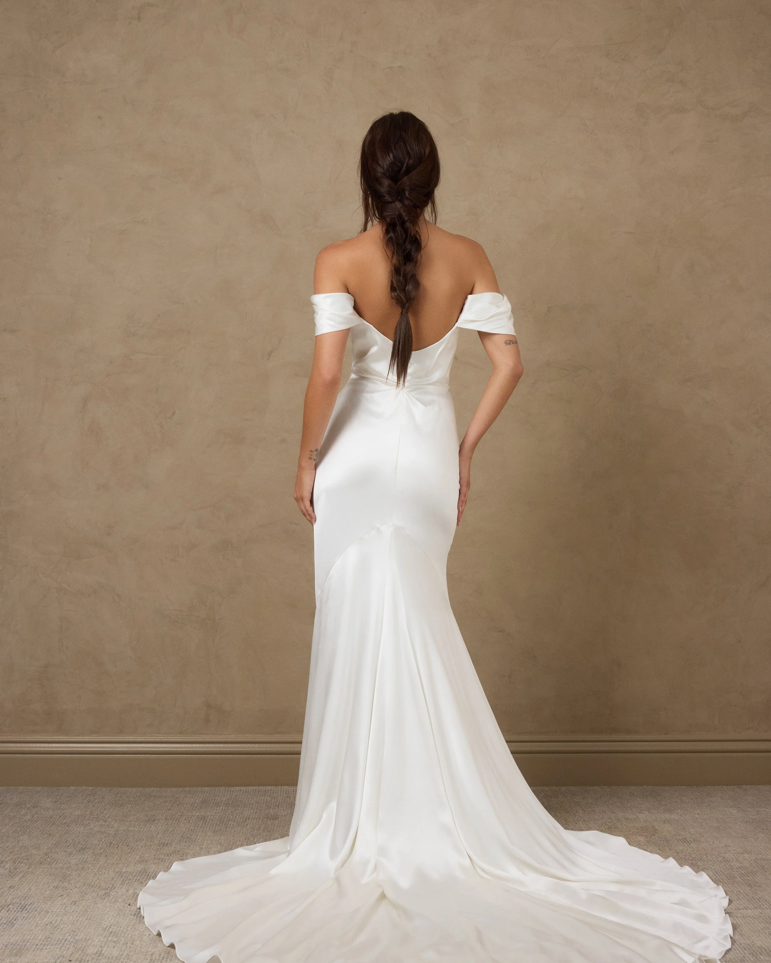 Satin silk crepe gown, bias cut with a fluid drape. Features a draped detail that wraps around the body, a gently flared slim A-line skirt, and interior corset in the bodice for structure and support.