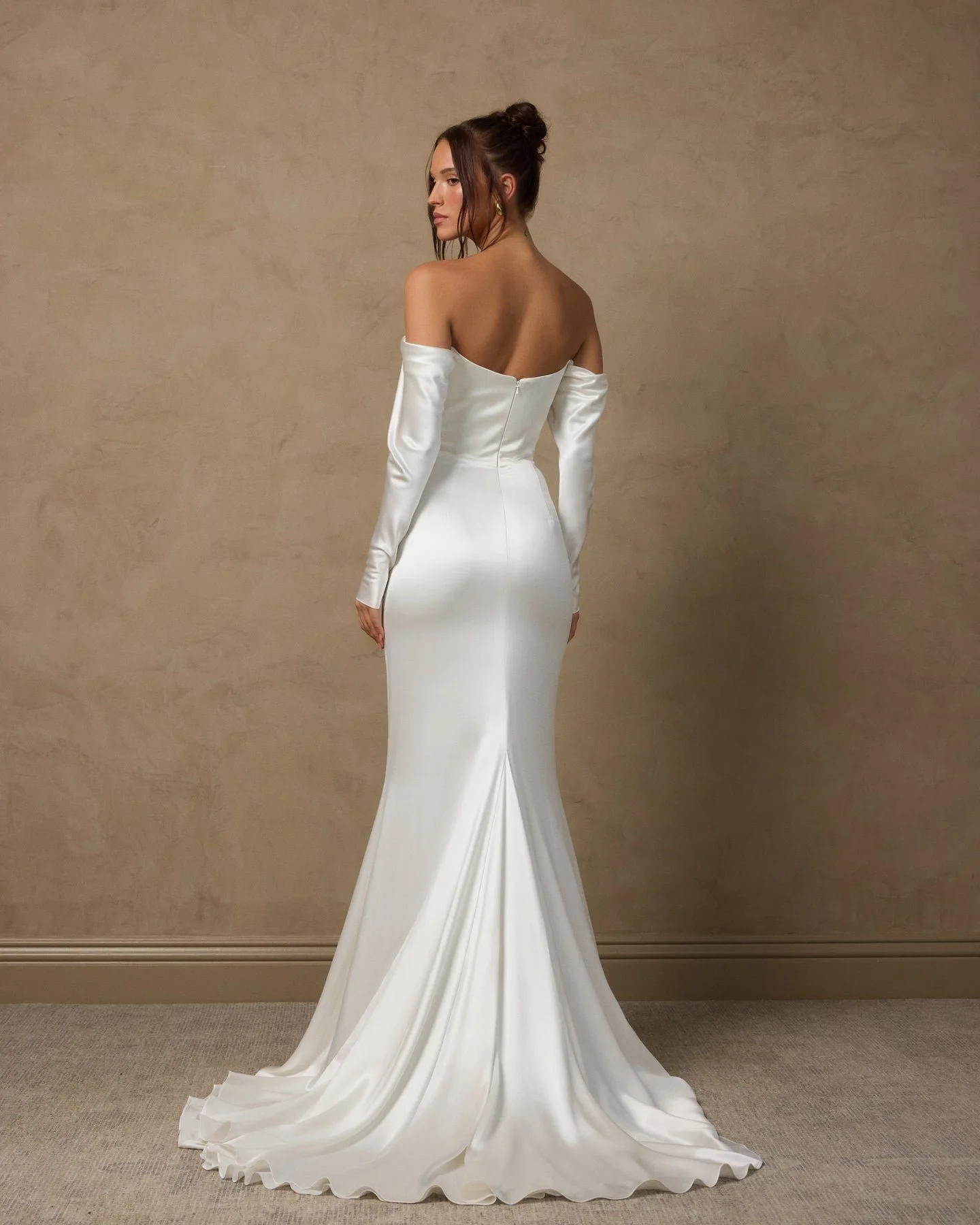 Satin silk crepe gown with a slim fit skirt and effortless draping across the bust and waist. Features long sleeves that are fully detachable for versatile styling. Finished with a center back zipper closure.