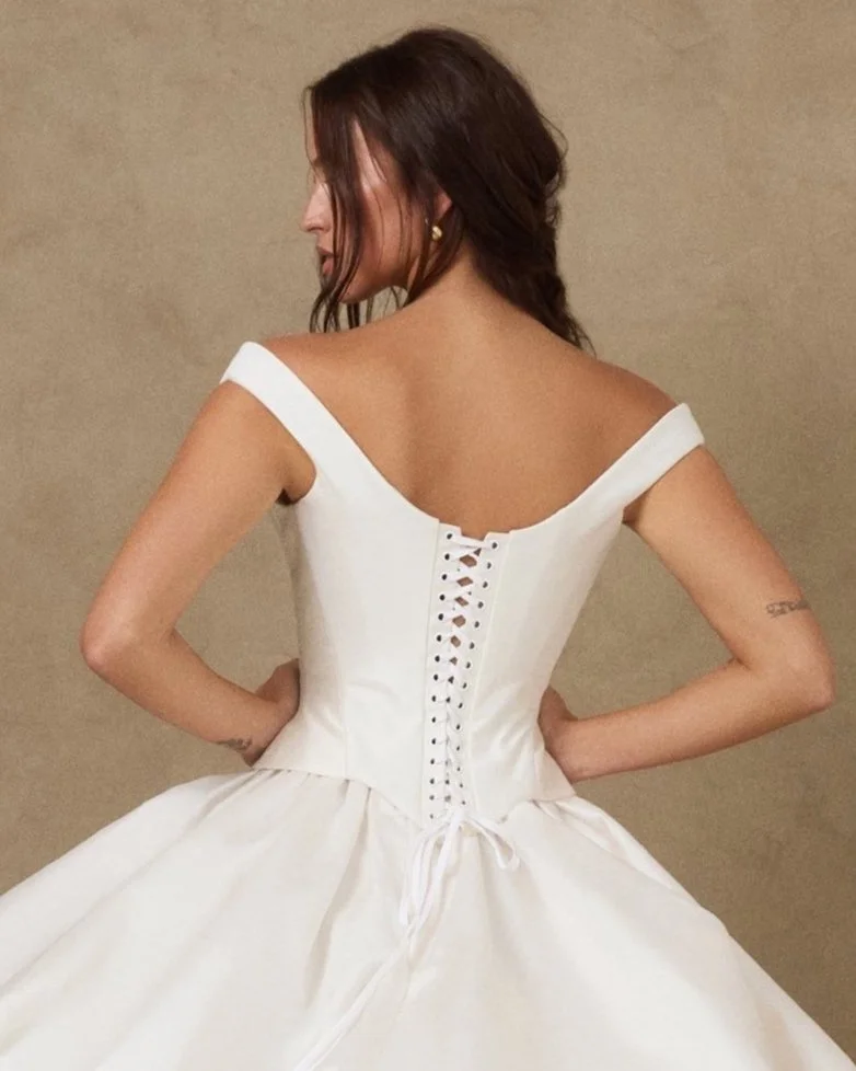 A flattering ffully structured scoop corset, complete with a lace-up back and peplum hem. Perfectly paired with the Paloma column skirt for a chic, modern look.