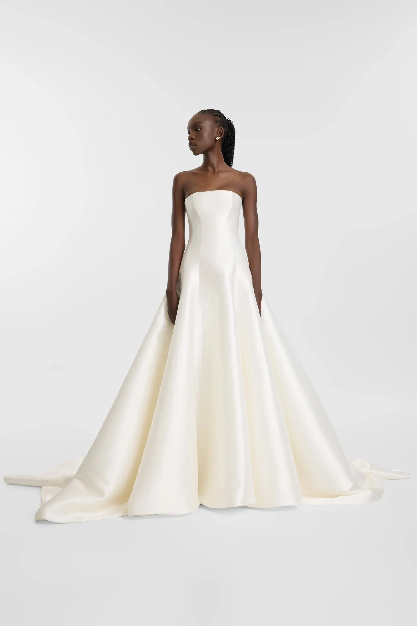 Contemporary couture meets nostalgic nuance in Adler. Architectural in form yet fluid in movement, this strapless gown is cut from lustrous Mikado holds its sculptural shape. A clean, straight neckline sets creates a modern edge, while the structured bodice releases into a sweeping full skirt with folding swathes of luxe fabric. Minimalist in detail, maximal in presence, Adler distils couture discipline into pure, striking simplicity.