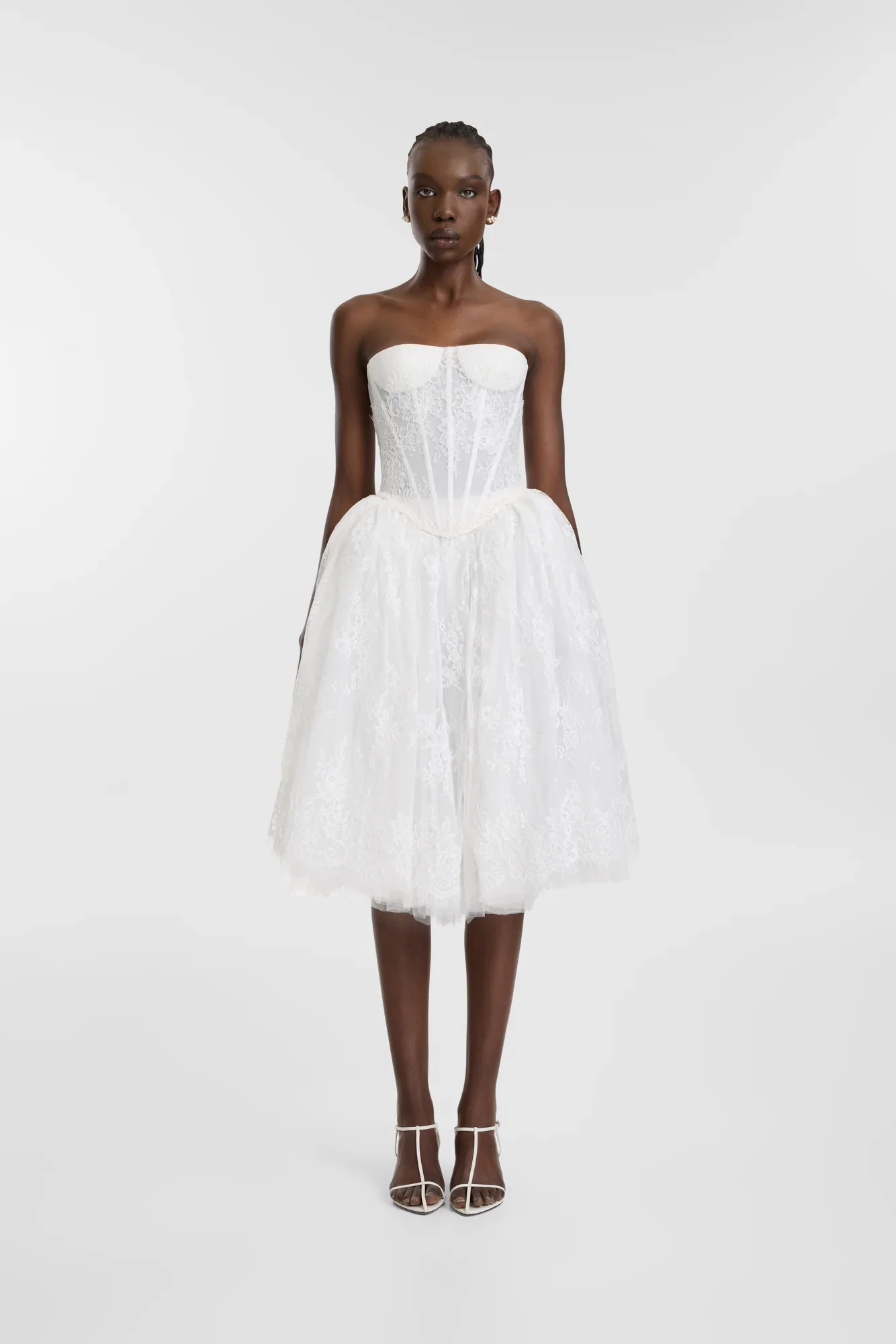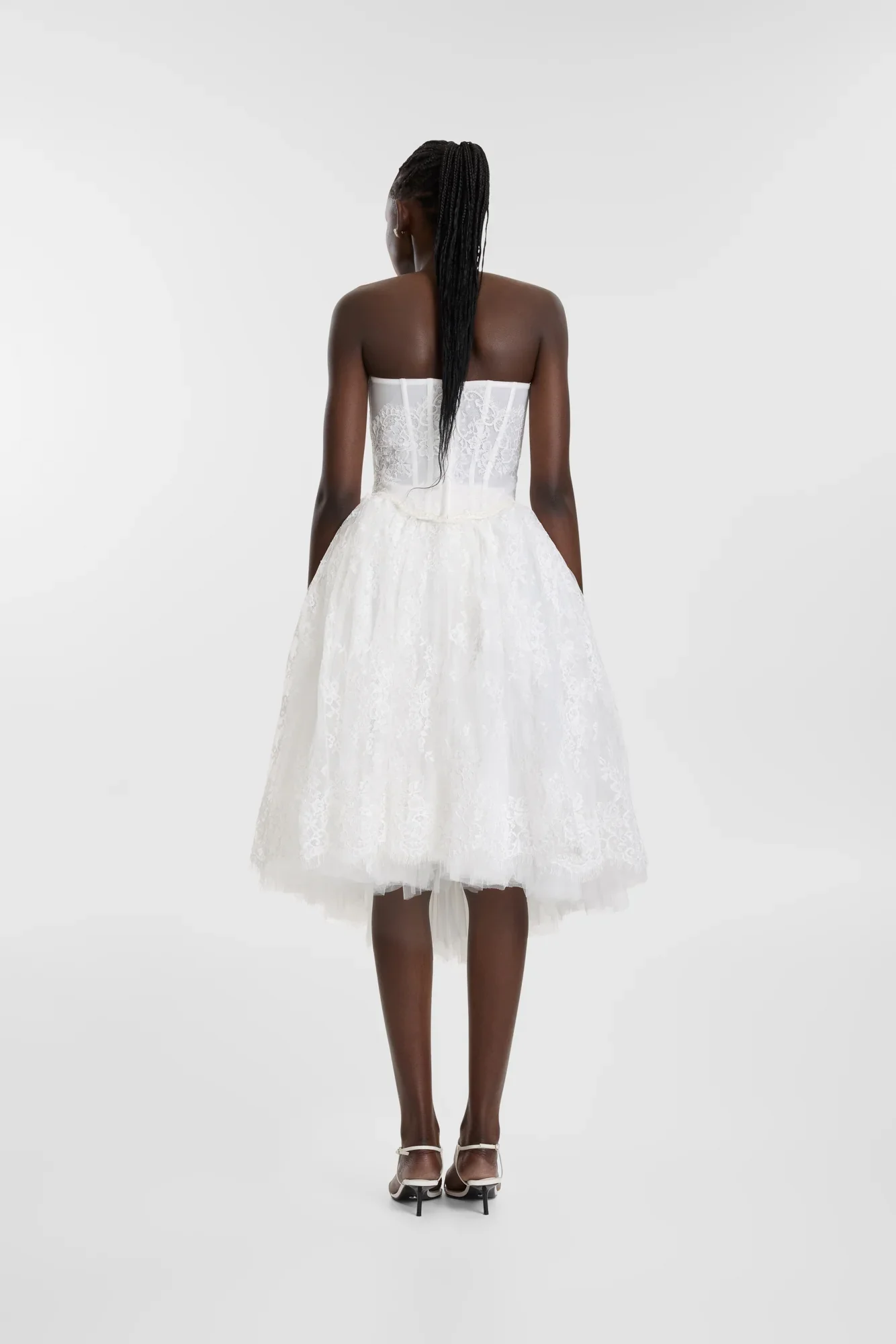Balletcore continuing to live rent free in our mind via the en pointe Basu. Cut to fall at the knee, Basu skirt brings frothy lace volume to your look. Layers of tulle and lace create a buoyancy, cropped to wear as an elevated separate with the Baia corset or layered with the Amur skirt for a maximalist addition to an all-lace look.