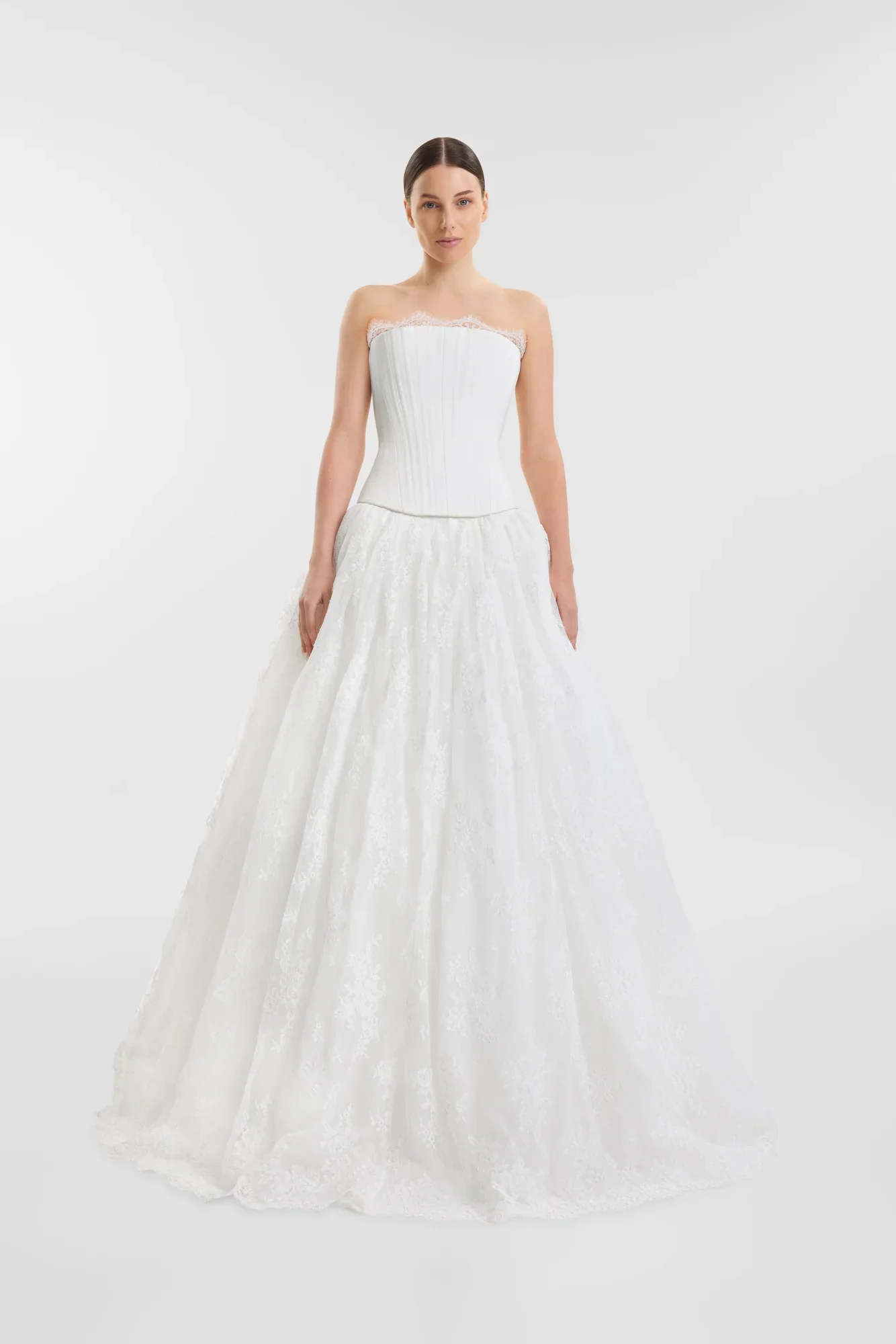 FIT: Structured extended bodice with boning channeling and lace trim neckline.