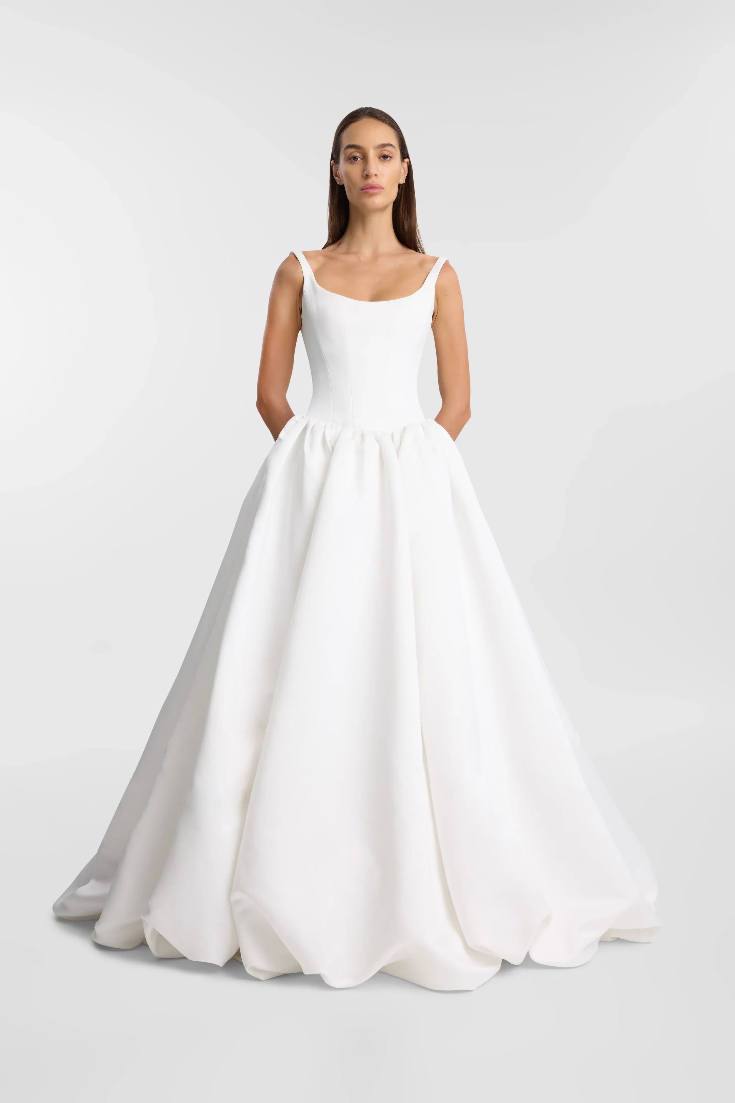 FIT: Structured drop waist corset with internal bust cups, gathered balloon skirt nets to create volume, internal ties for adjustable length, full train.