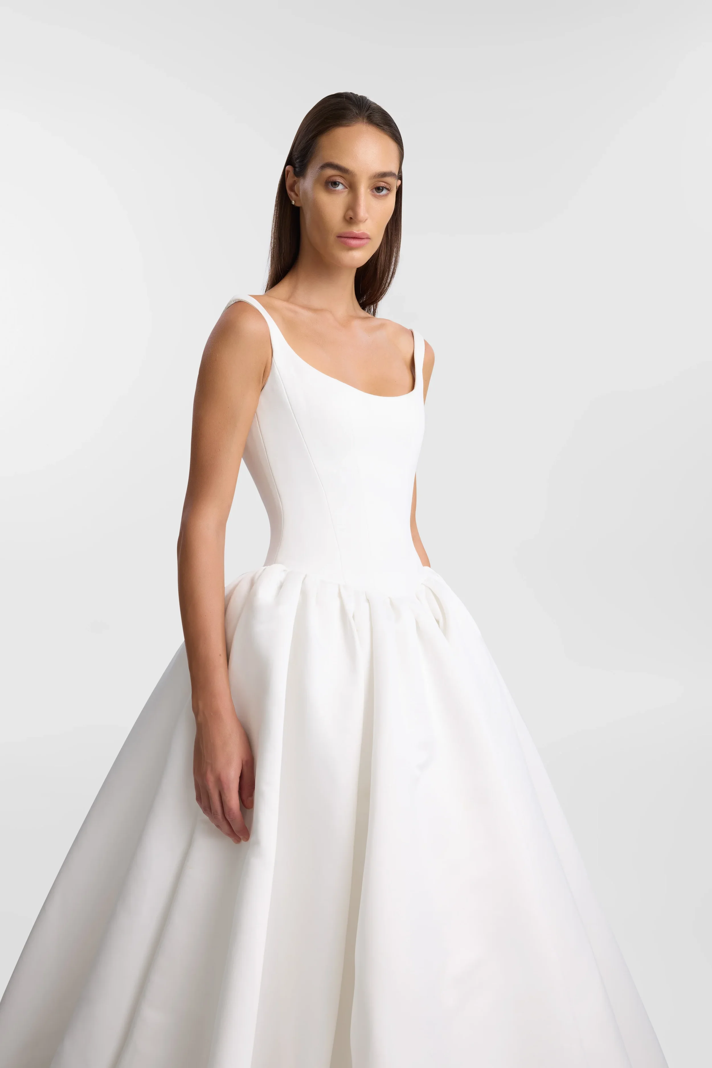 You’re a powerful presence in Emery. A fresh take of a timeless silhouette, Emery balances sculpted precision with cloud-like airiness. A scoop-neck, corseted bodice flows into a gathered skirt, embodying KYHA’s signature play on structure and softness. Adjustable in length, Emery transforms seamlessly from sweeping floor-length drama to a party-ready knee-length. Cut from lustrous duchess satin, Emery commands attention with every step.