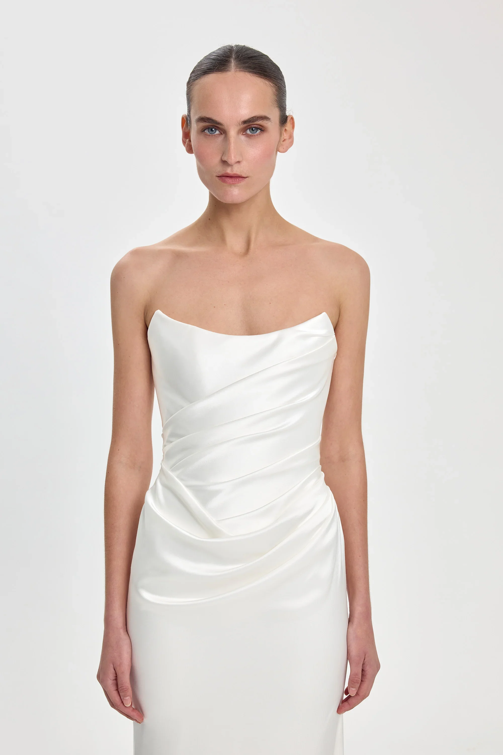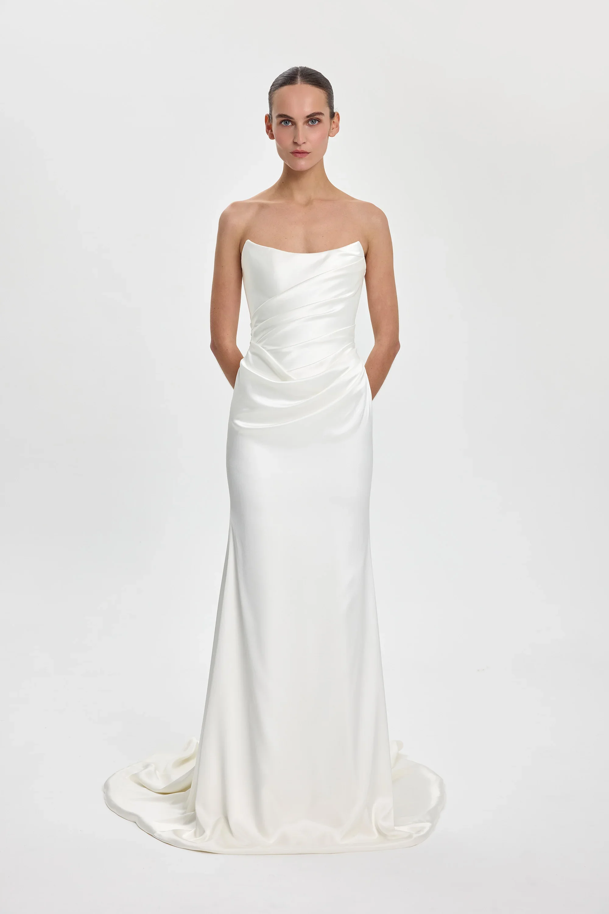 Fit: Soft scoop neckline, longline draped structured corset. Column skirt with soft waist draping and full train.