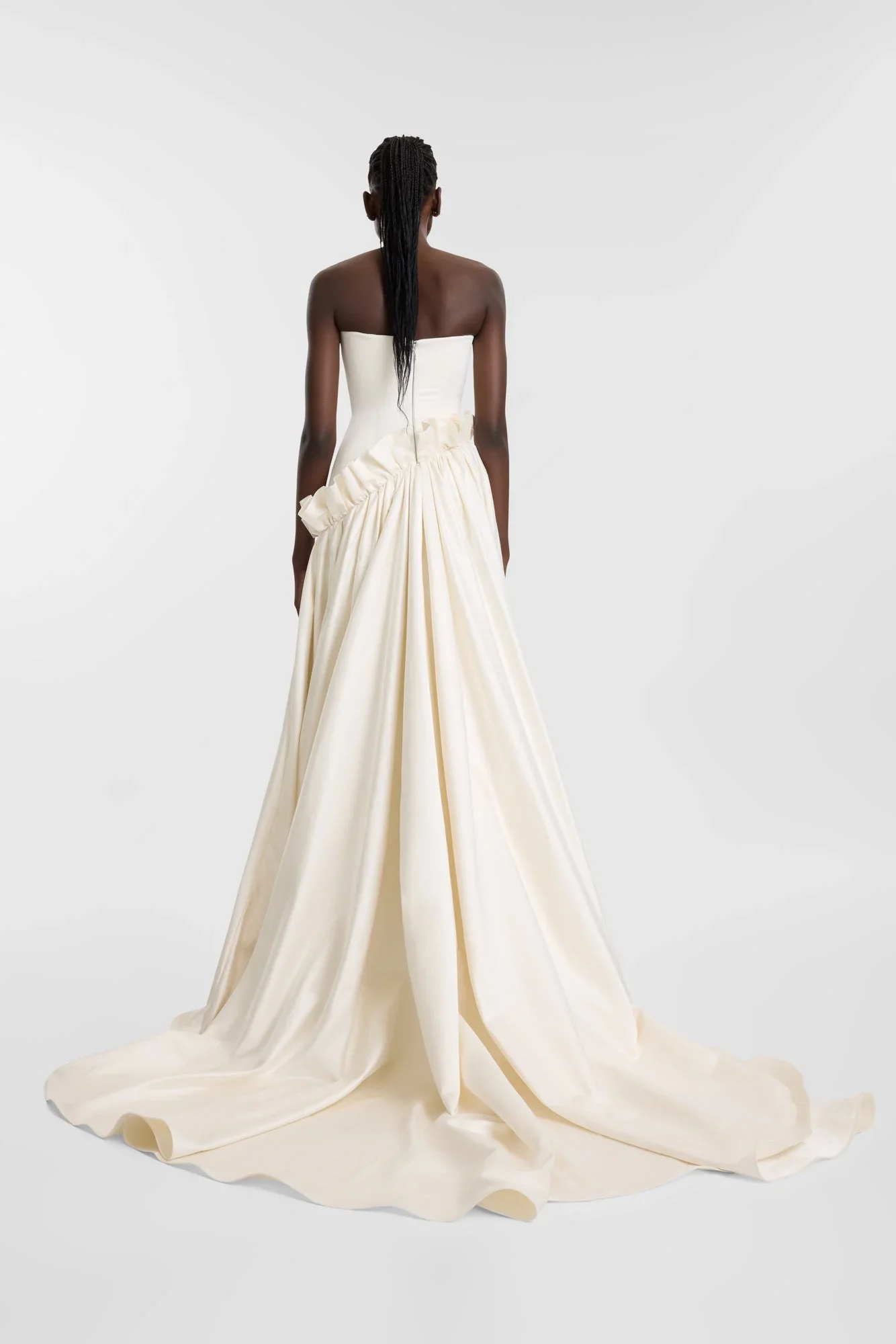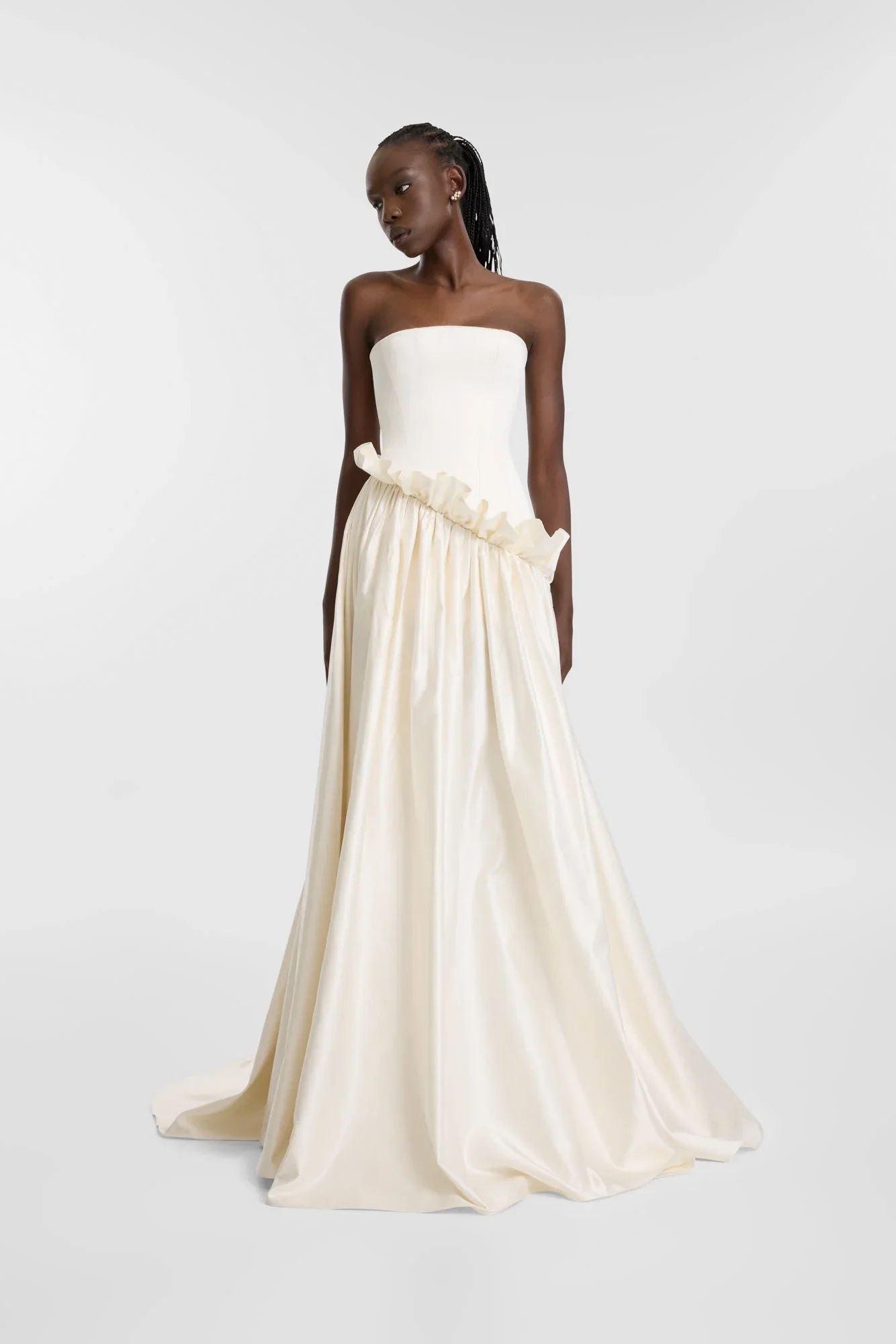 Ruffling the sartorial status quo in Lotus. Introducing a new and luxurious creamy silk satin, Lotus features a modern straight neckline, structured, drop waist bodice and an asymmetric a-line skirt with a high-impact gather. For the fashion-forward amongst us, Lotus boasts a unique a ruffle detail - optional but highly recommended.