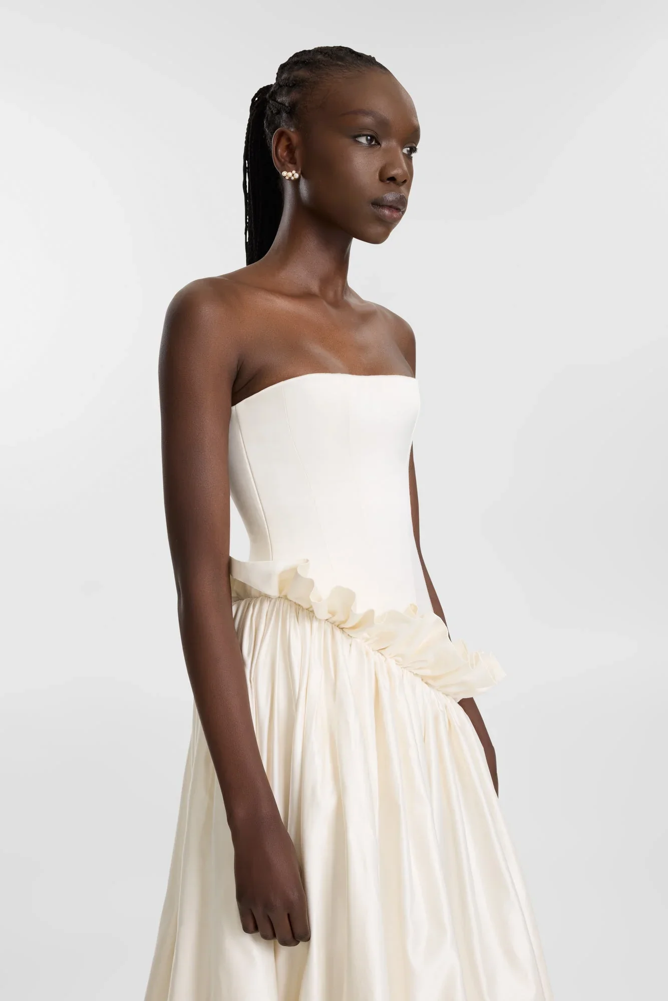 FIT: Structured bodice with internal corsetry. Asymmetrical full gathered skirt with waist frill detail.