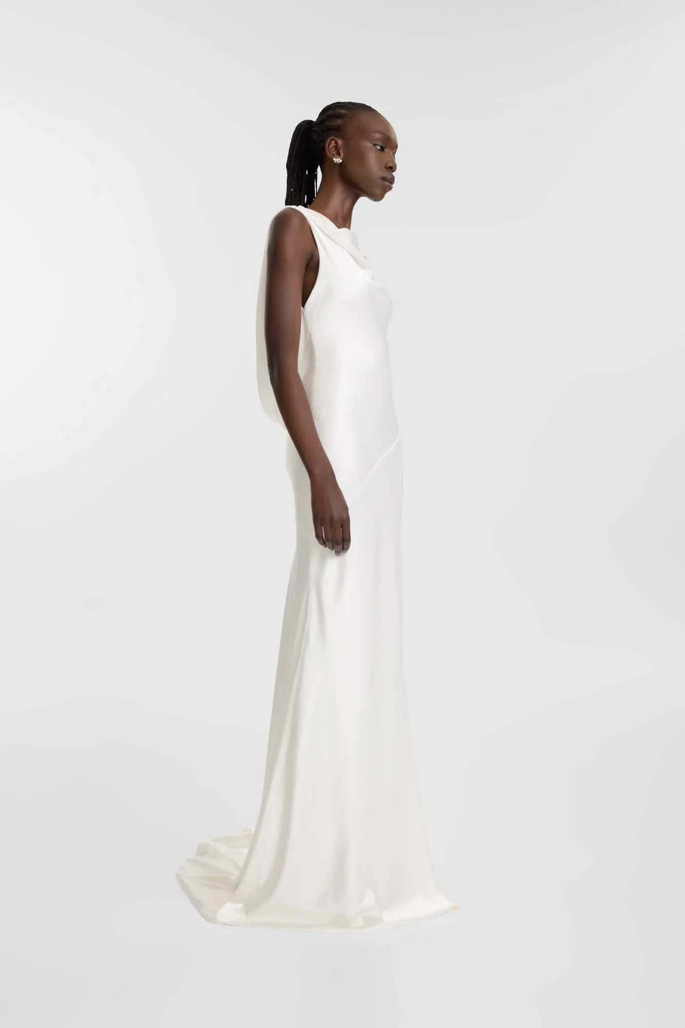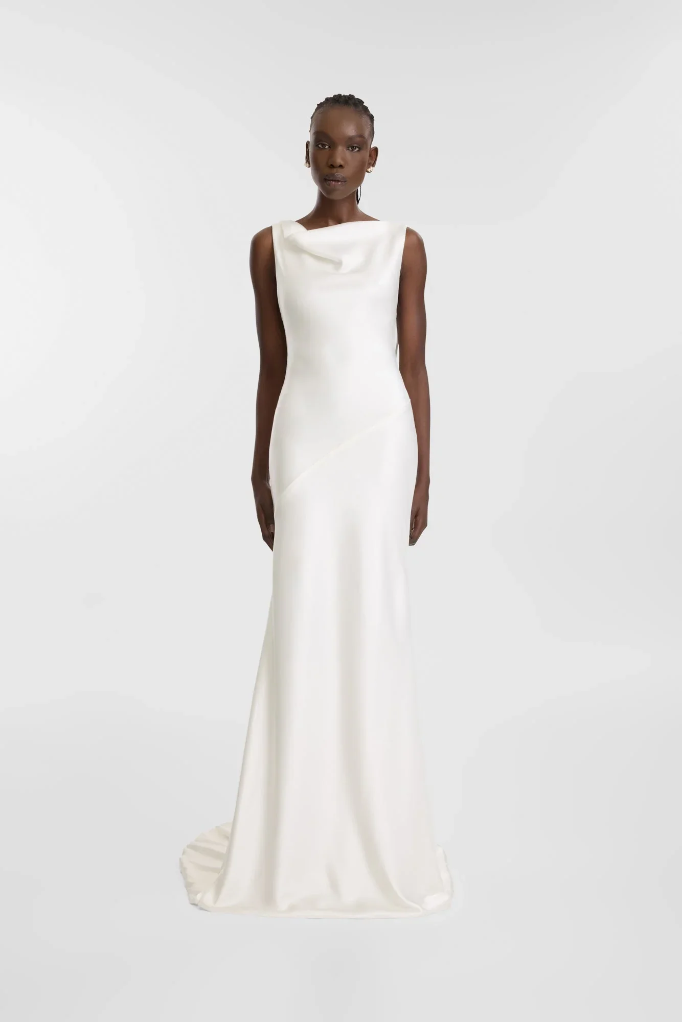 FIT: Slinky satin bias gown with front cowl neckline and deep cowl back.