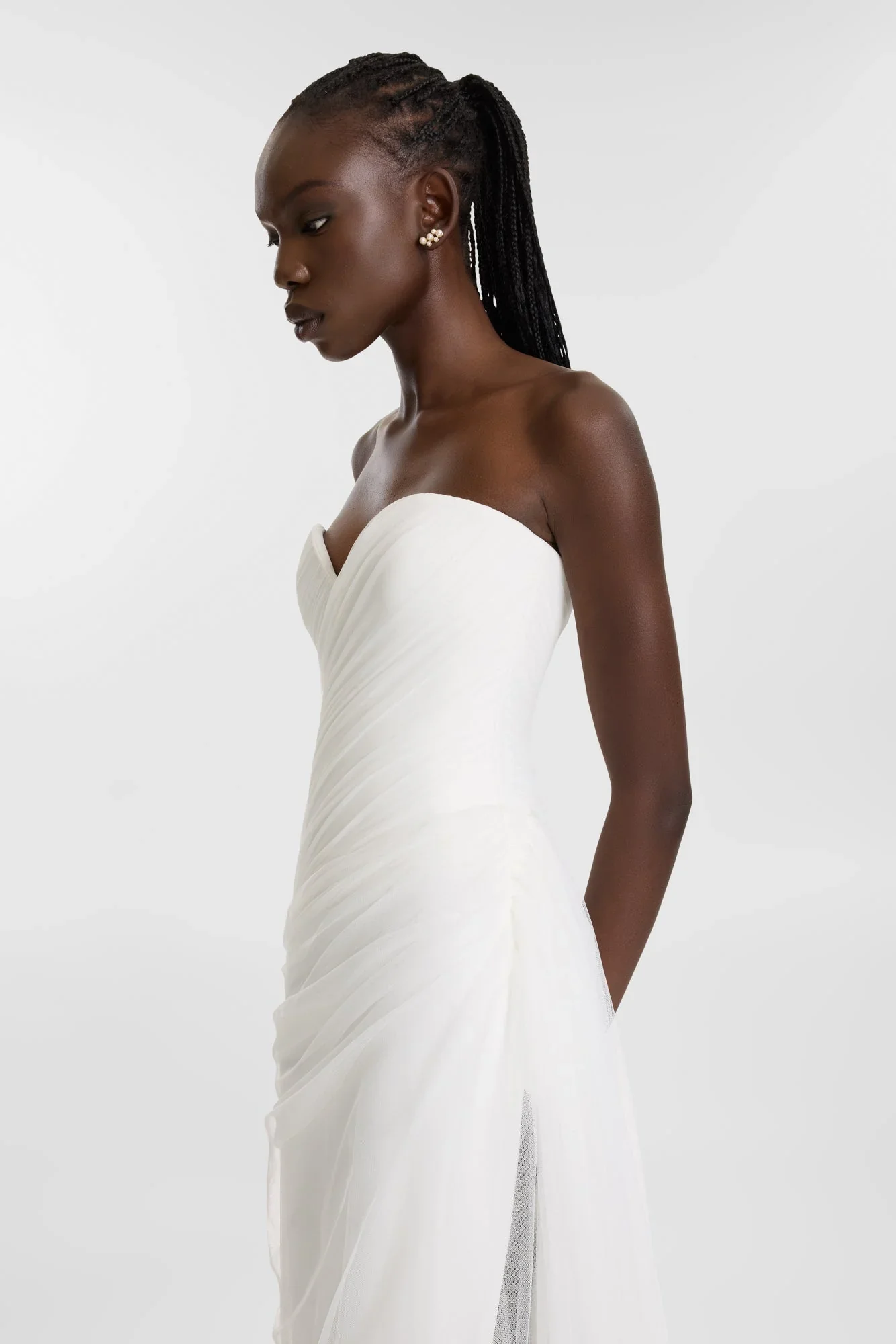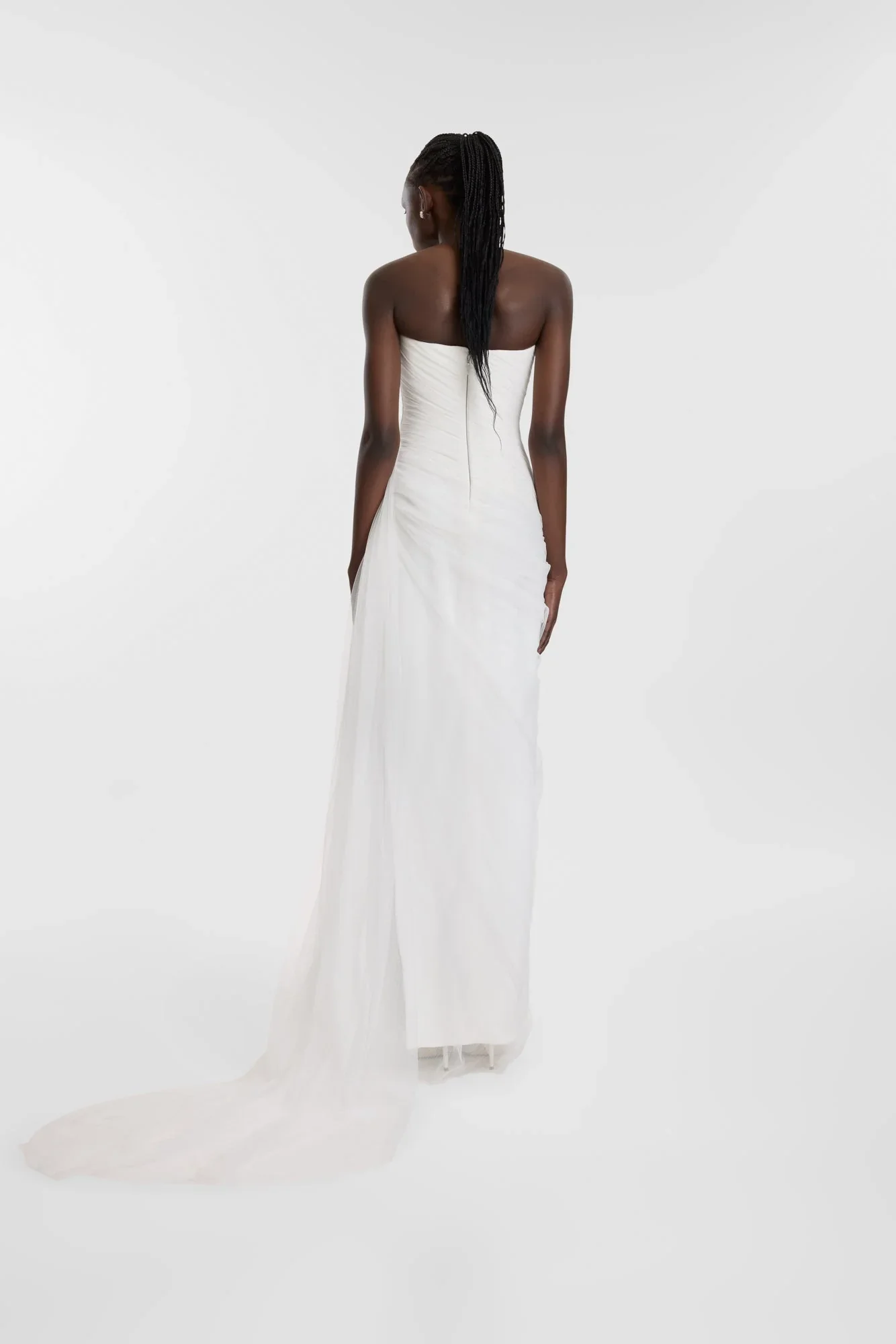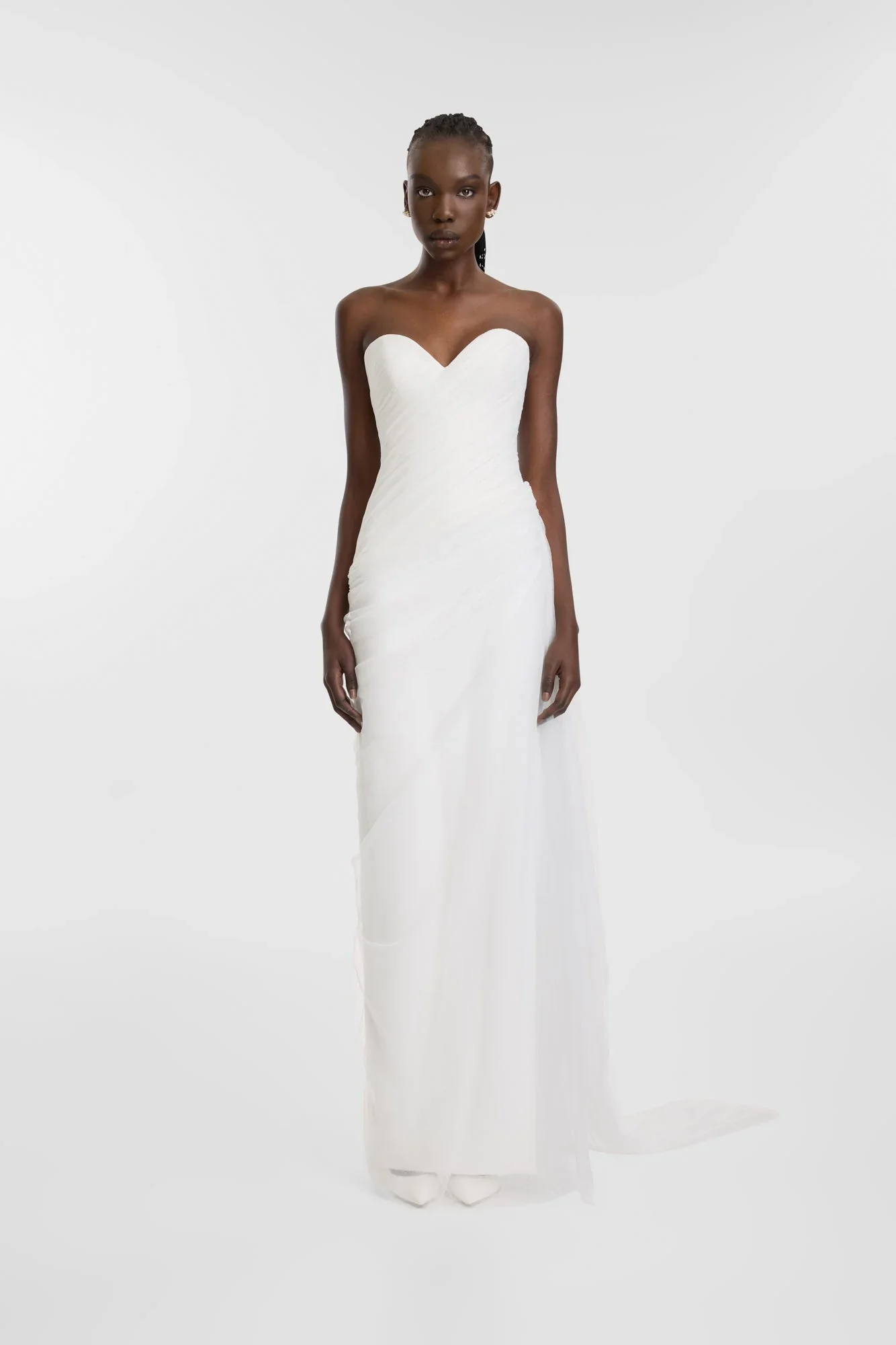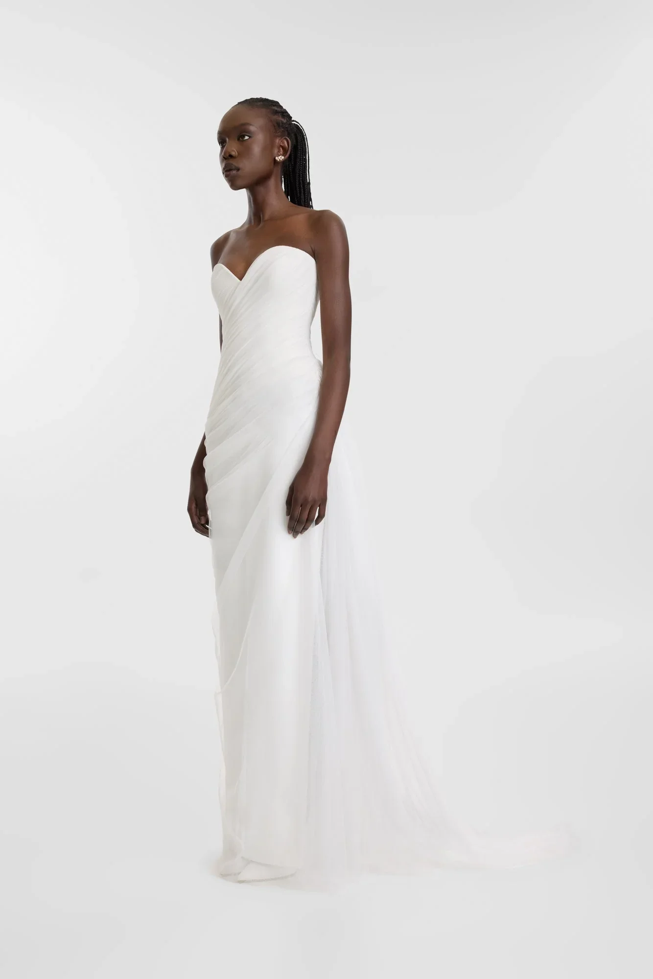 FIT: Structured gown with sweetheart neckline and draped tulle overlay. Column skirt with a split at left hand side and a tulle train extending from the skirt draping.