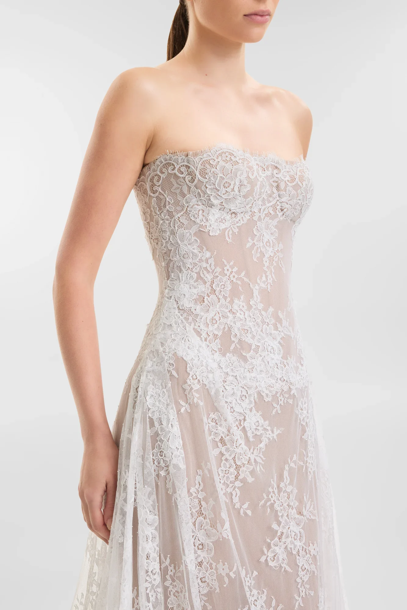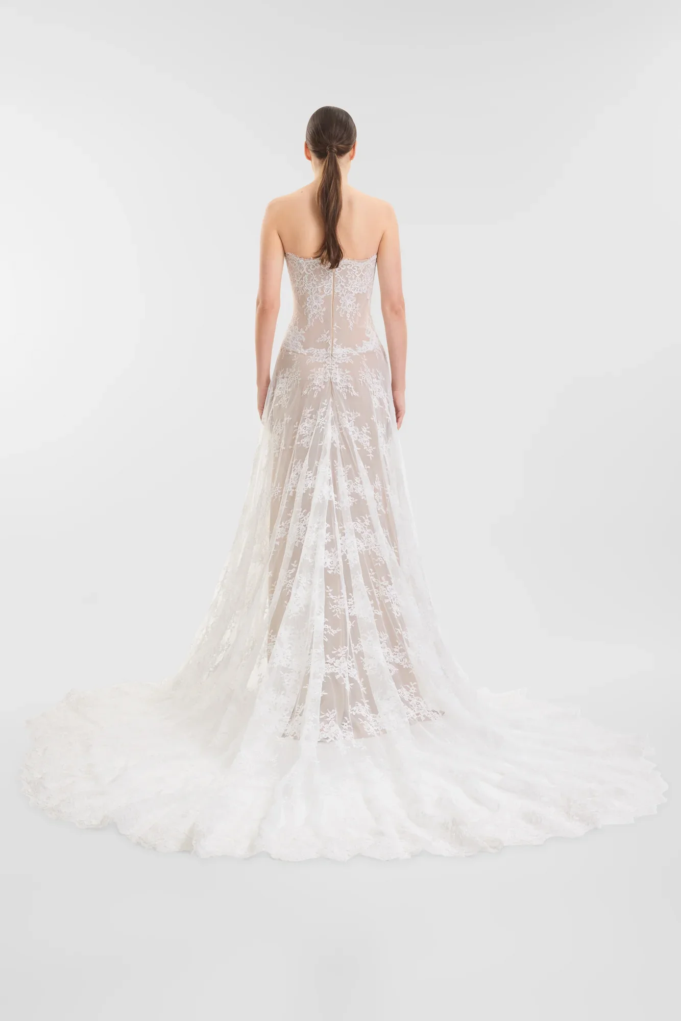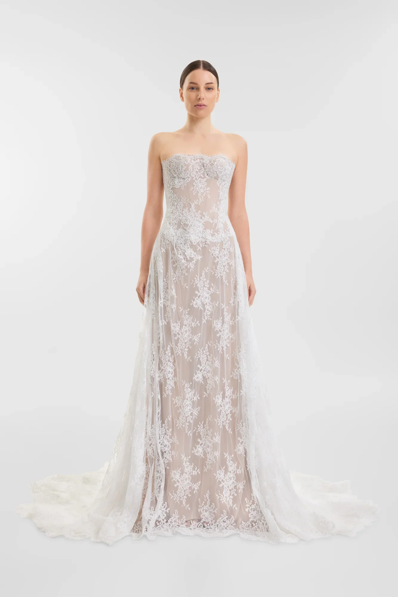 FIT: Corseted bodice with bust cups and lace overlay with scalloped edge along neckline. Draped lace skirt with scallop edge along hemline and around train.