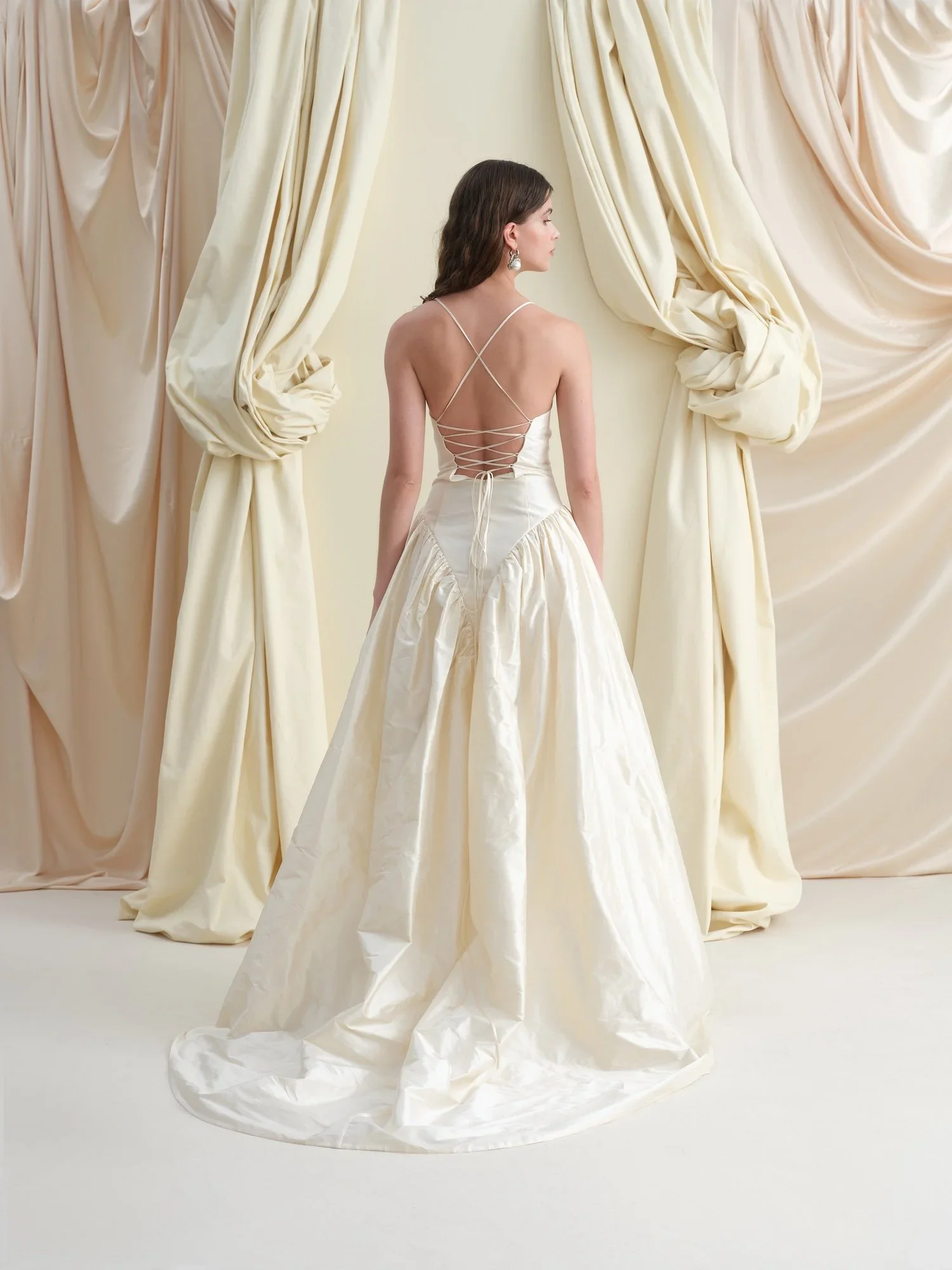 An open back and lace up detailing, not only looks feminine but allows a perfect fit on the bodice of the gown. The low back leads down to a V to mirror the design on the front, with the gathered skirt panels leading to a sweeping train. Internally the bodice is lined in silk, while the skirt is lined in two layers of soft tulle helping the skirt to keep its volume while also remaining incredibly light to wear.
