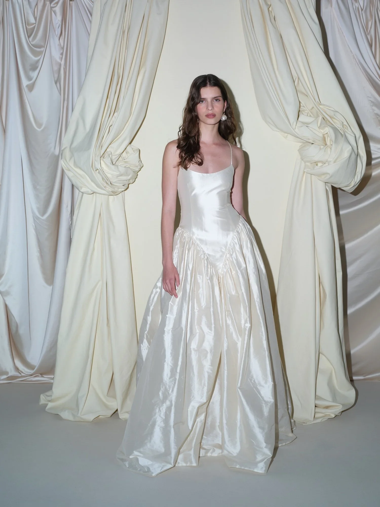 The Solene gown is crafted from the most incredible tone of golden, cream silk Dupion. Light in structure, but thoughtfully fitted to the female form, Solene is whimsical, romantic and incredibly chic. Solene features a gentle scoop neckline on the fitted bodice, with a Basque waist narrowing to a point at the front, where the gathered skirt panels fold into each other.