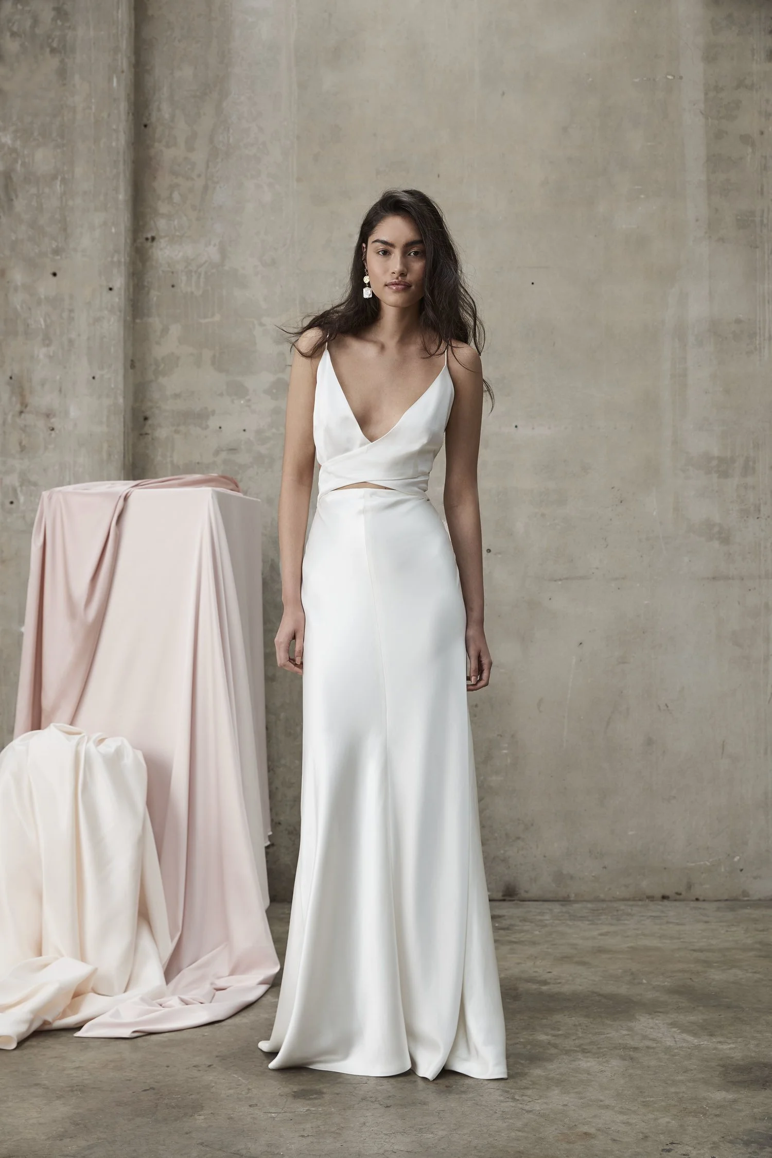 The Tyler is a tailored slimline gown in a heavy but fluid satin. The bodice is double-fused to give it a smooth and structured look. With her cross-over bodice detail, spaghetti straps and a beautiful bias-cut skirt, the Tyler gown is a modern twist on the slip dress.