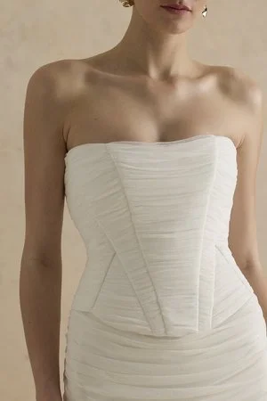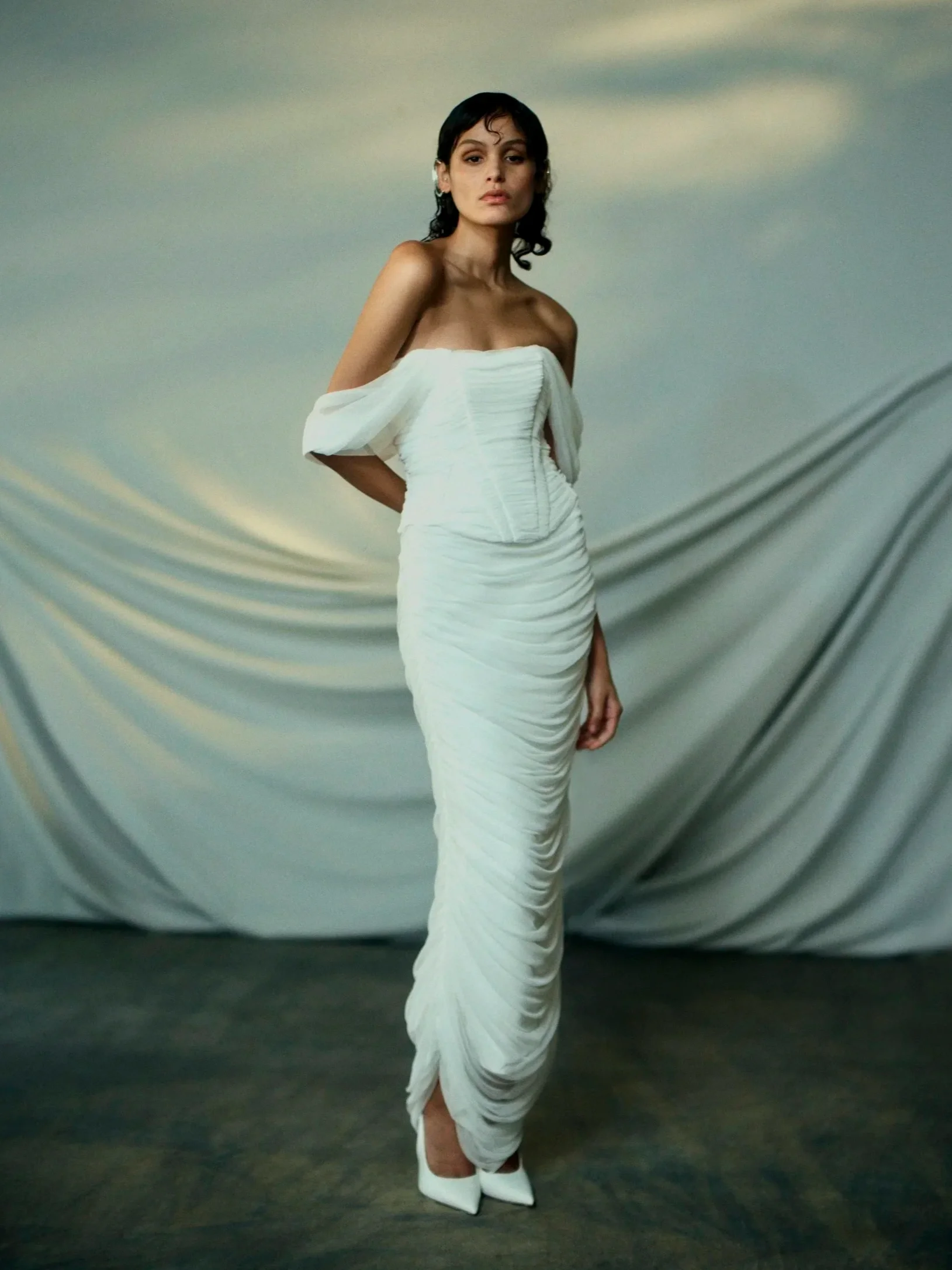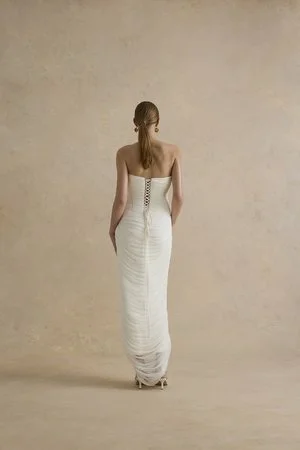 The Sage corset features a panelled silhouette, crafted with layers of finely gathered silk tulle over a matte silk base. Internally boned and lined in silk satin, it offers a sculpted fit with a clean finish. A subtle flash of skin peeks through the lace-up detail at the centre back, adding a modern, understated sensuality. Sage pairs beautifully with the Solange skirt as pictured.