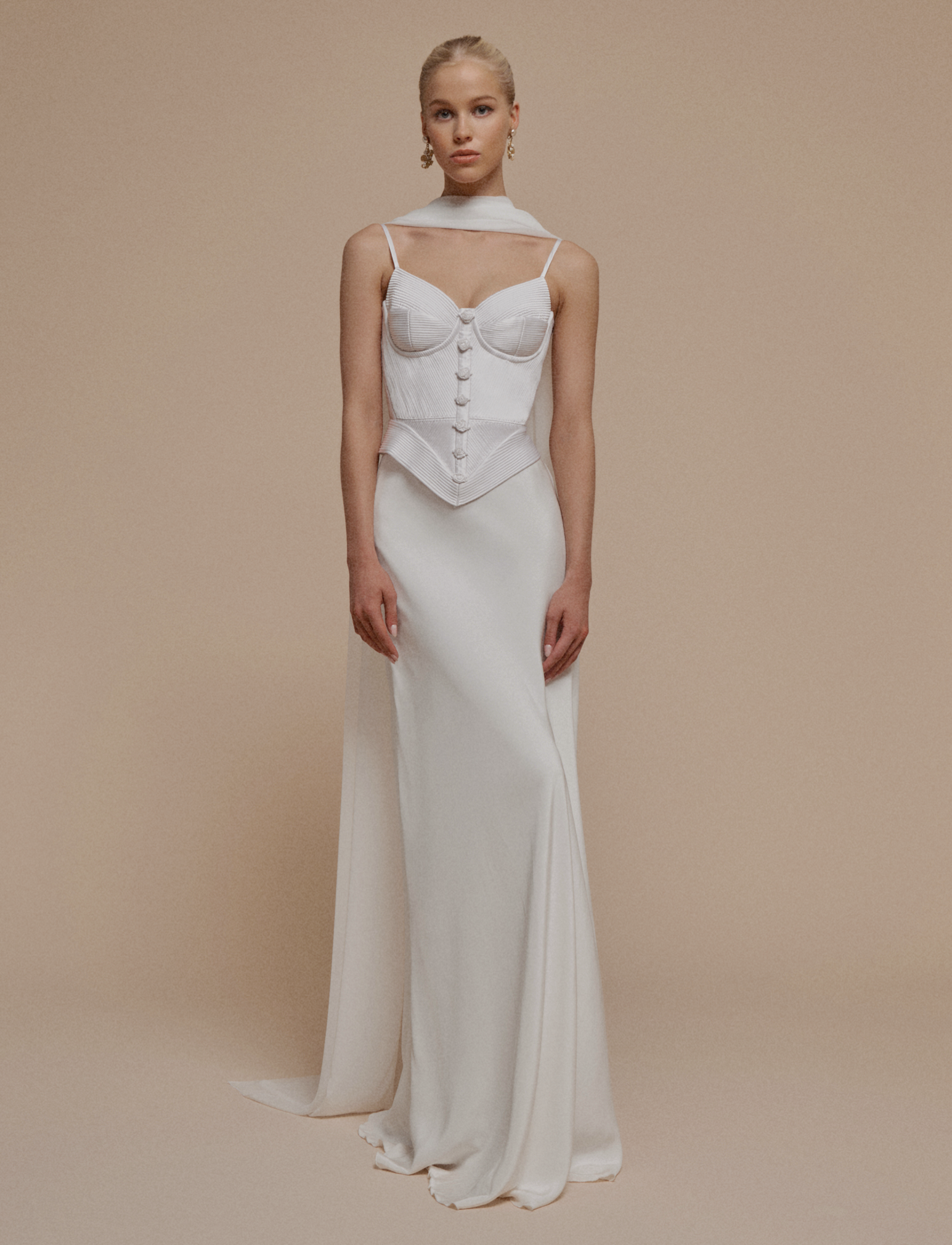 The Josephine Silk Chiffon Scarf is all about effortless sophistication. Crafted from light, luxurious silk chiffon, this floor-length accessory brings a touch of refined elegance to any bridal look. Draping beautifully as it trails behind you, it moves with an airy grace that feels both chic and understated. The Josephine scarf is a versatile styling piece that elevates any look. Perfect for the bride seeking a modern, romantic layer to complete her look.