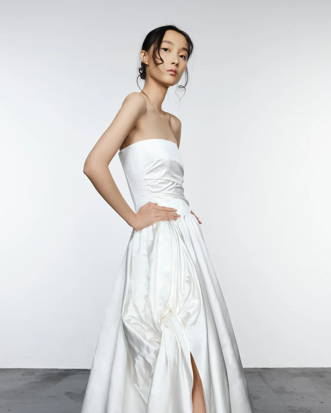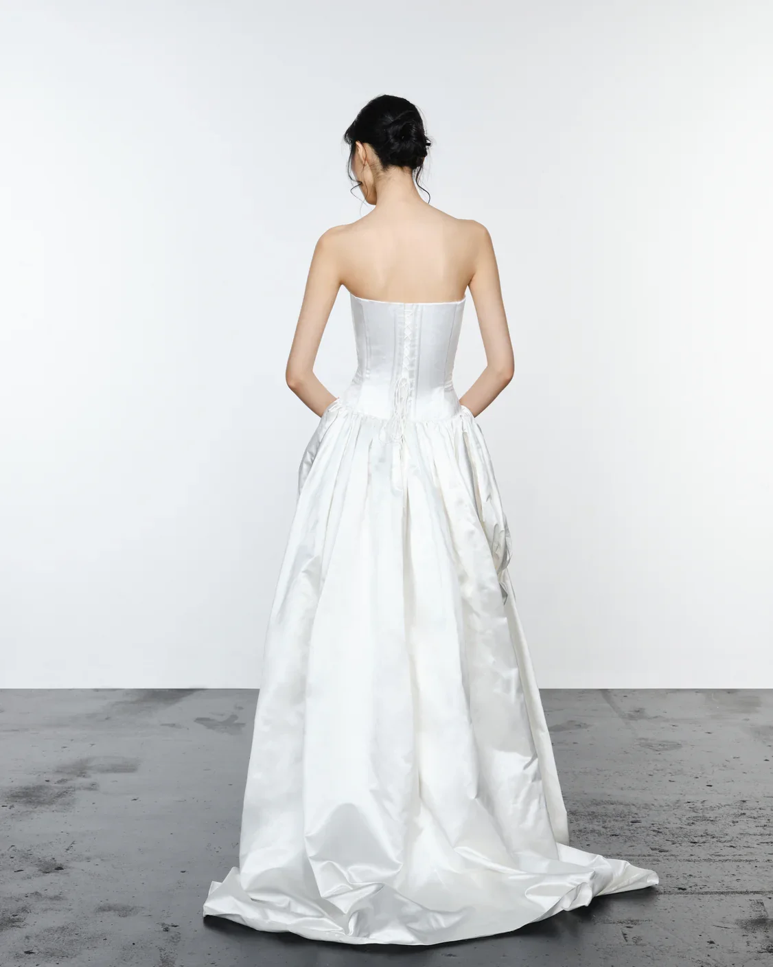 The Bidda Dress, part of our classic collection, is a classic silhouette redefined with signature WED drapery in the corset bodice, a dropped waist, and bow side details. The full-length skirt is finished with wide side ties for subtle texture, offering a modern take on the classic gathered skirt.
