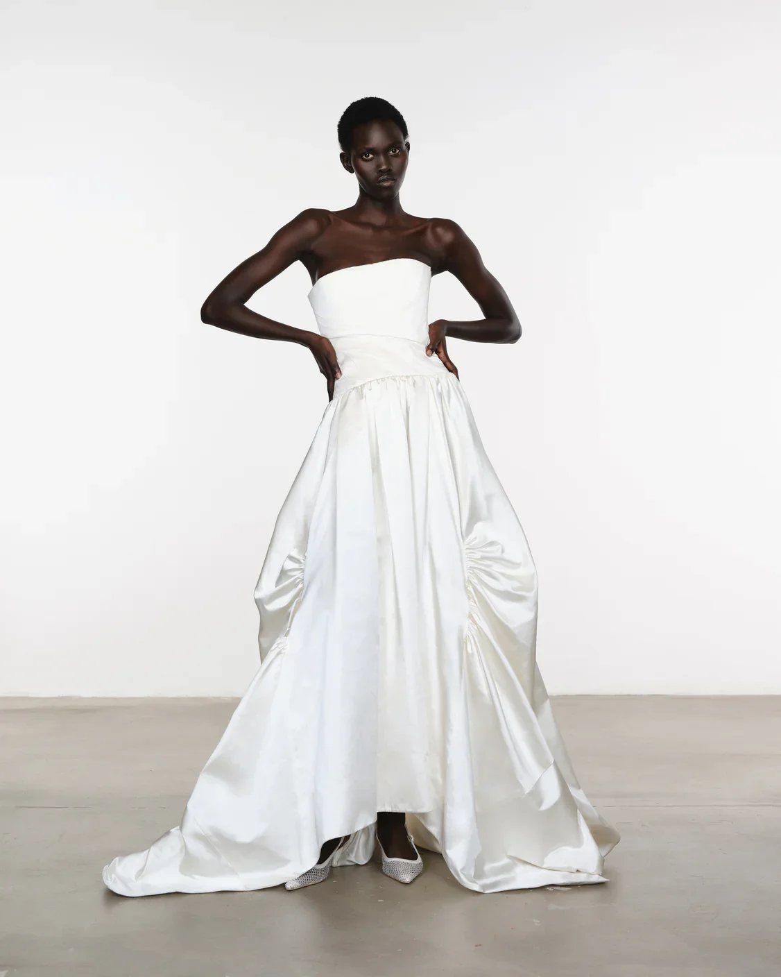 The Ursa Corset Dress seamlessly incorporates the modern, dramatic skirt drape, coupled with the WED signature draped corset. The dress is fully lined, creating a full and voluminous skirt.